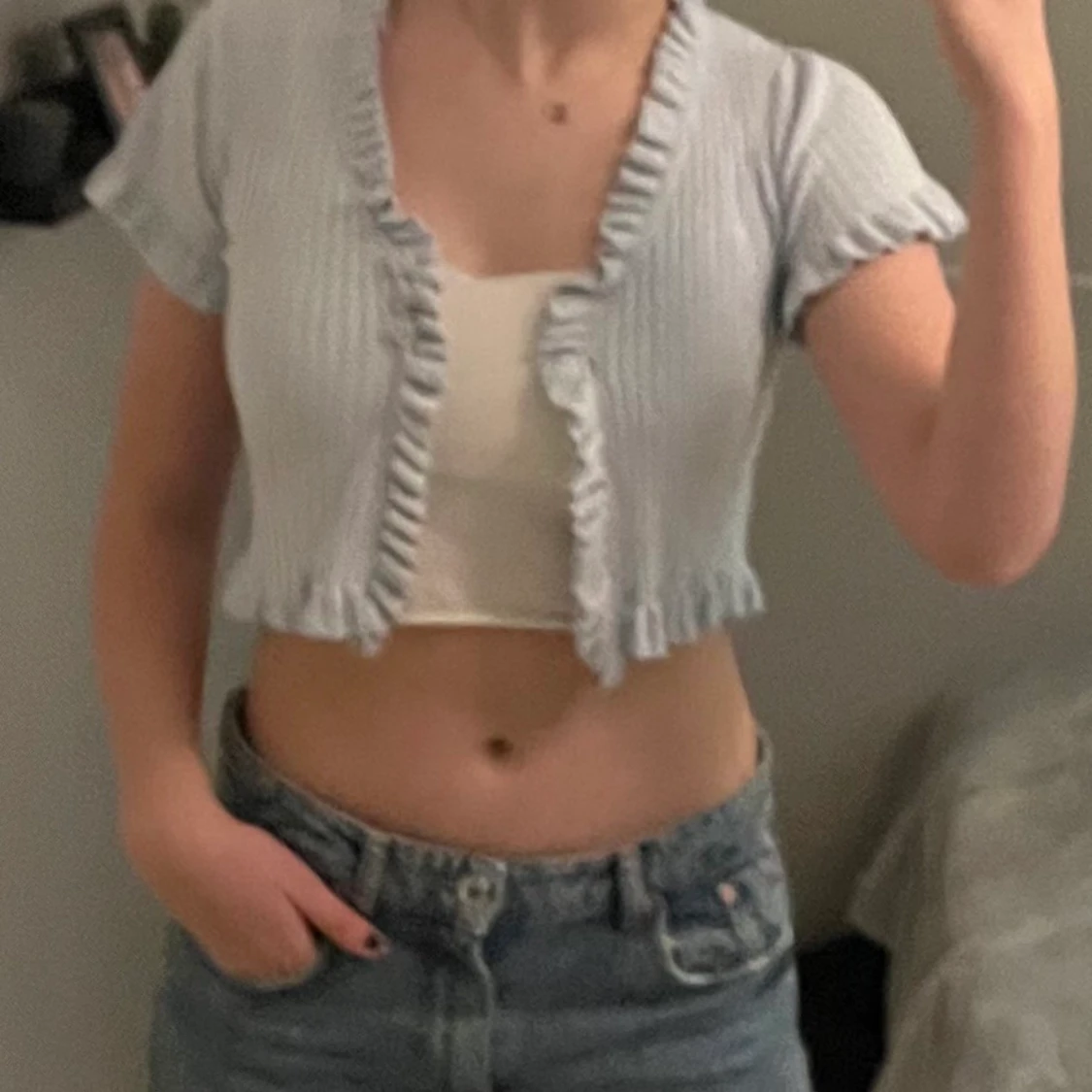 Blå croppad kofta med knappar från chiquelle. Koftan är i one size, men sitter som en S. Finns även i gul, kolla annonsen efter