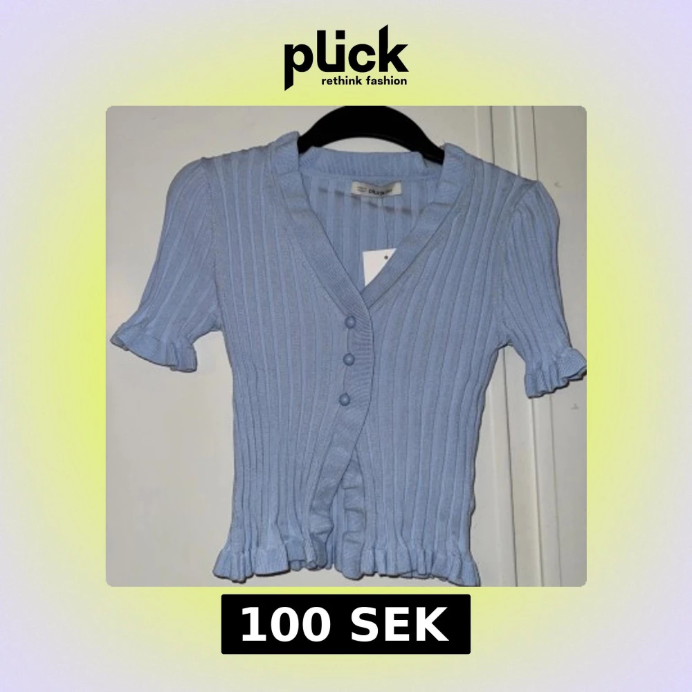 Superfin ljusblå ribbad topp från chiquelle med v-ringning och tre knappar framtill. Kortärmad med volangdetaljer vid ärmslut och nederkant. Stickad känsla och slim passform, perfekt för dig som gillar söta detaljer och mjuka färger.