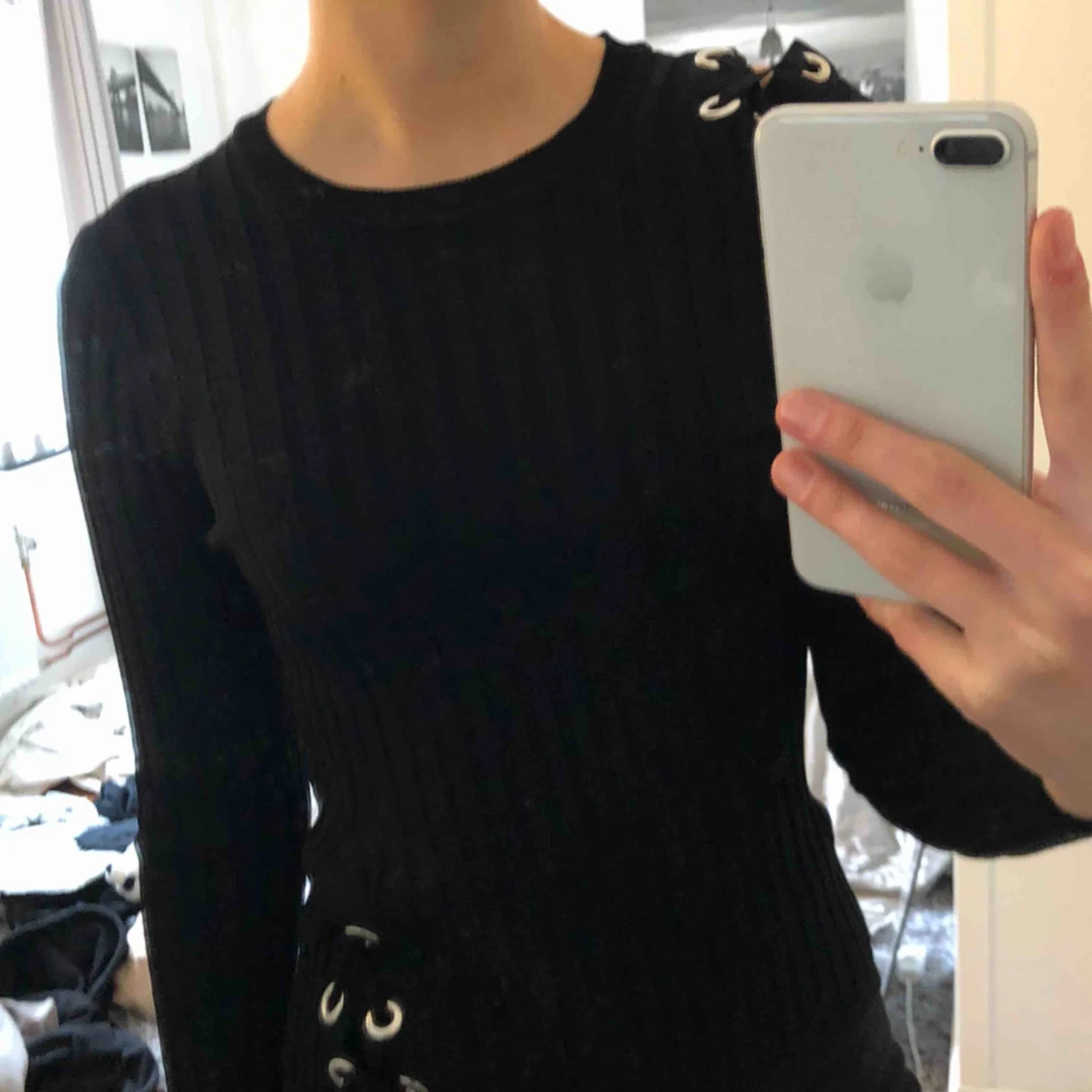 Skitcool svart ribbad tröja från Chiquelle!! Går att knyta på höger axel och vänster midja. Helt nytt skick 😘