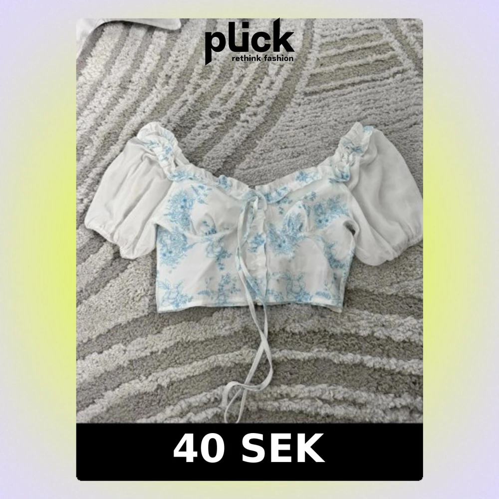 Supersöt croppad blus i vitt med ljusblått blommönster och puffiga korta ärmar. Toppen har snörning framtill, dragkedja bak och volangkant vid urringningen. Perfekt för en romantisk look och riktigt trendig just nu.