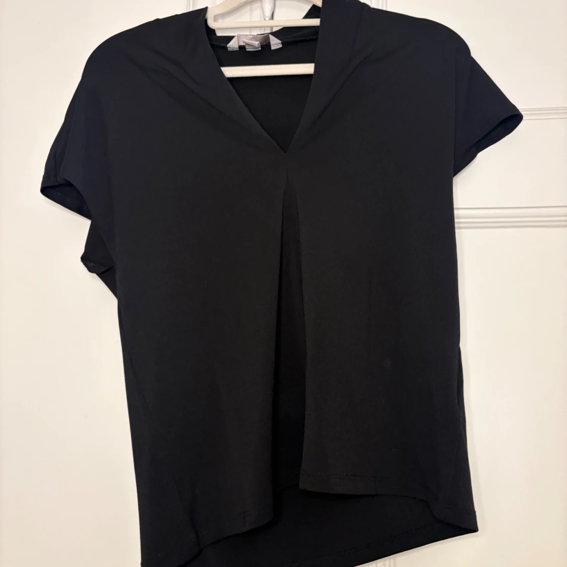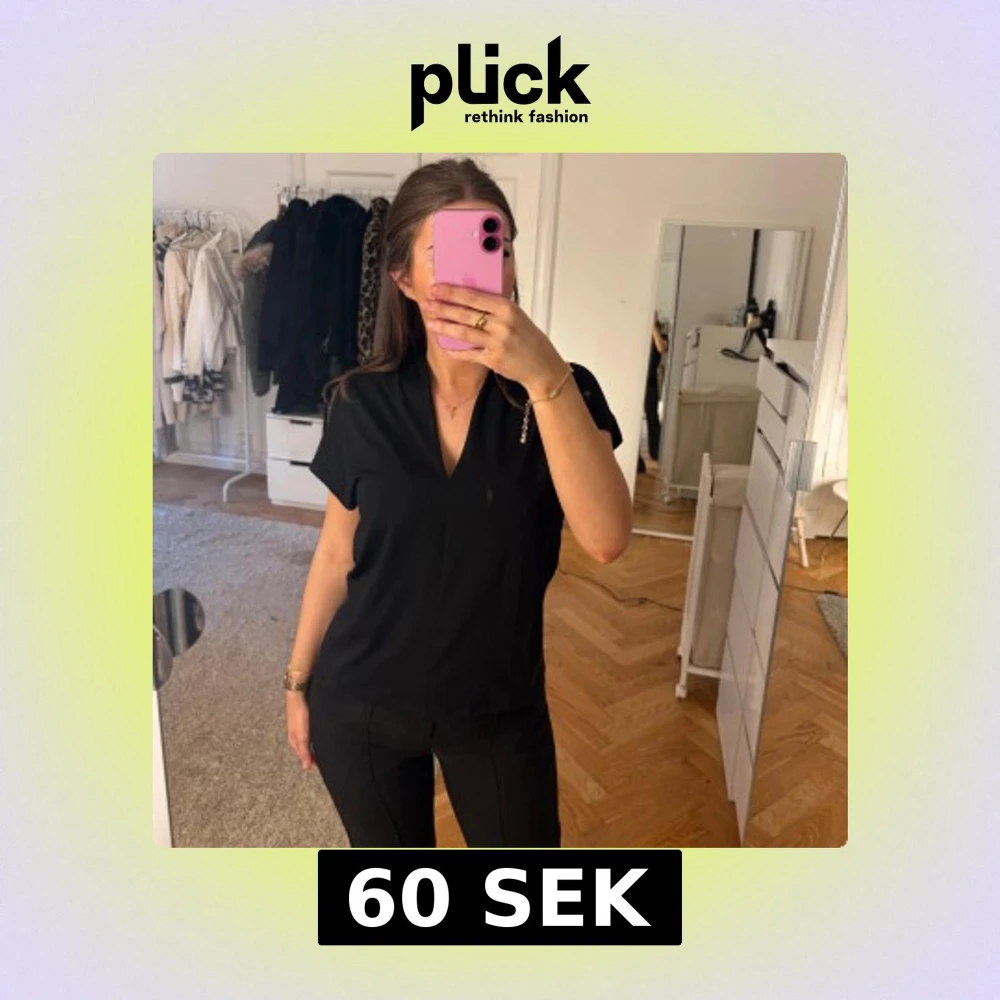 En svart blus med v-ringning och korta ärmar. Modellen är lite lösare och har en snygg vikt krage upptill. Perfekt till jeans eller kostymbyxor för en clean look.