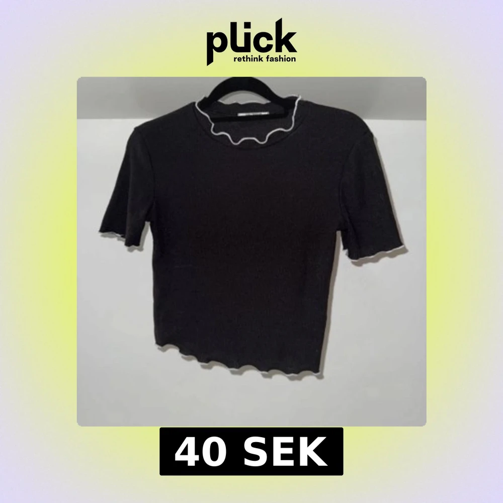 Svart ribbad topp med kort ärm och croppad passform. Toppen har vågiga kanter vid hals, ärmslut och nederkant, med en vit kontrastkant som ger en snygg detalj. Perfekt för dig som gillar stilrena plagg med en twist.