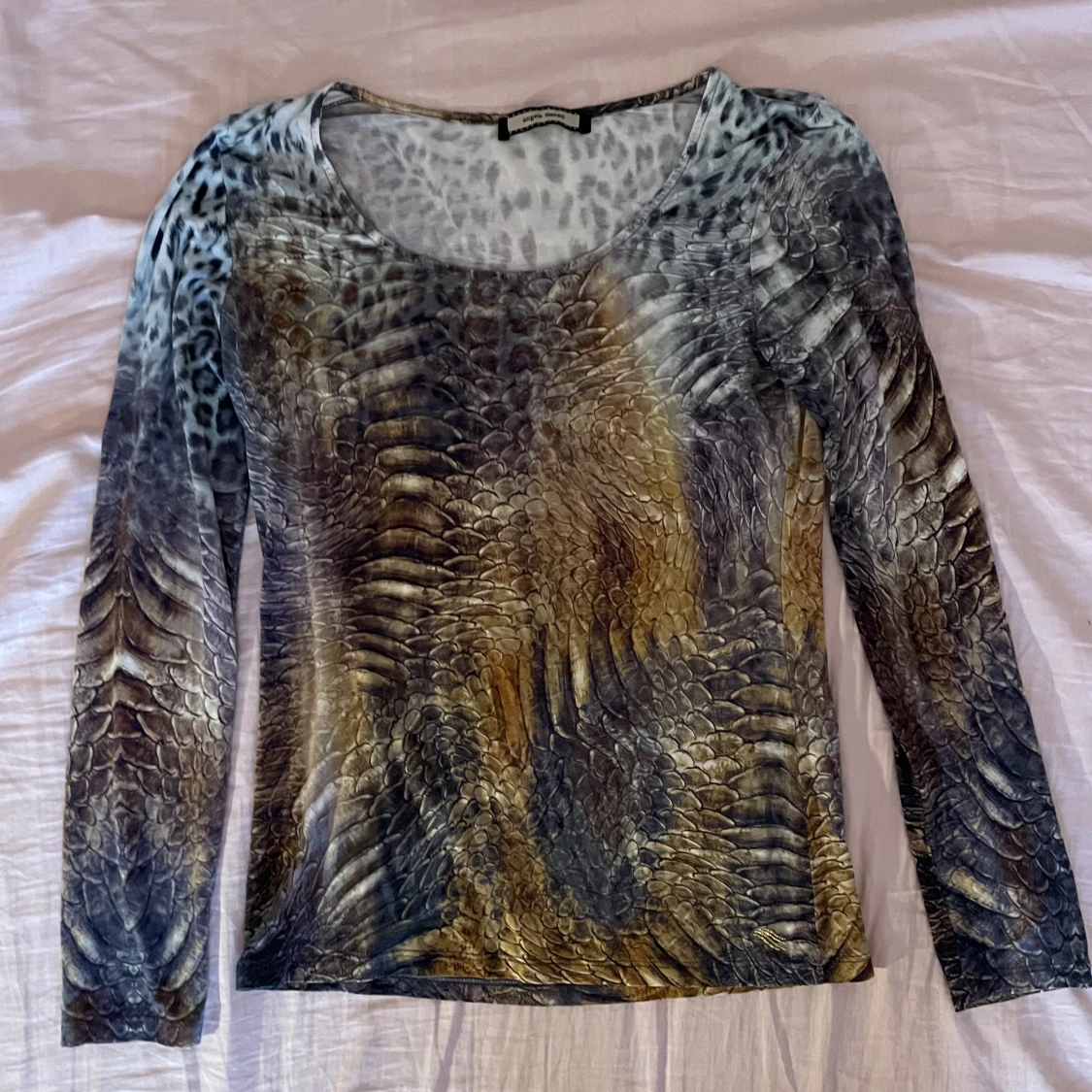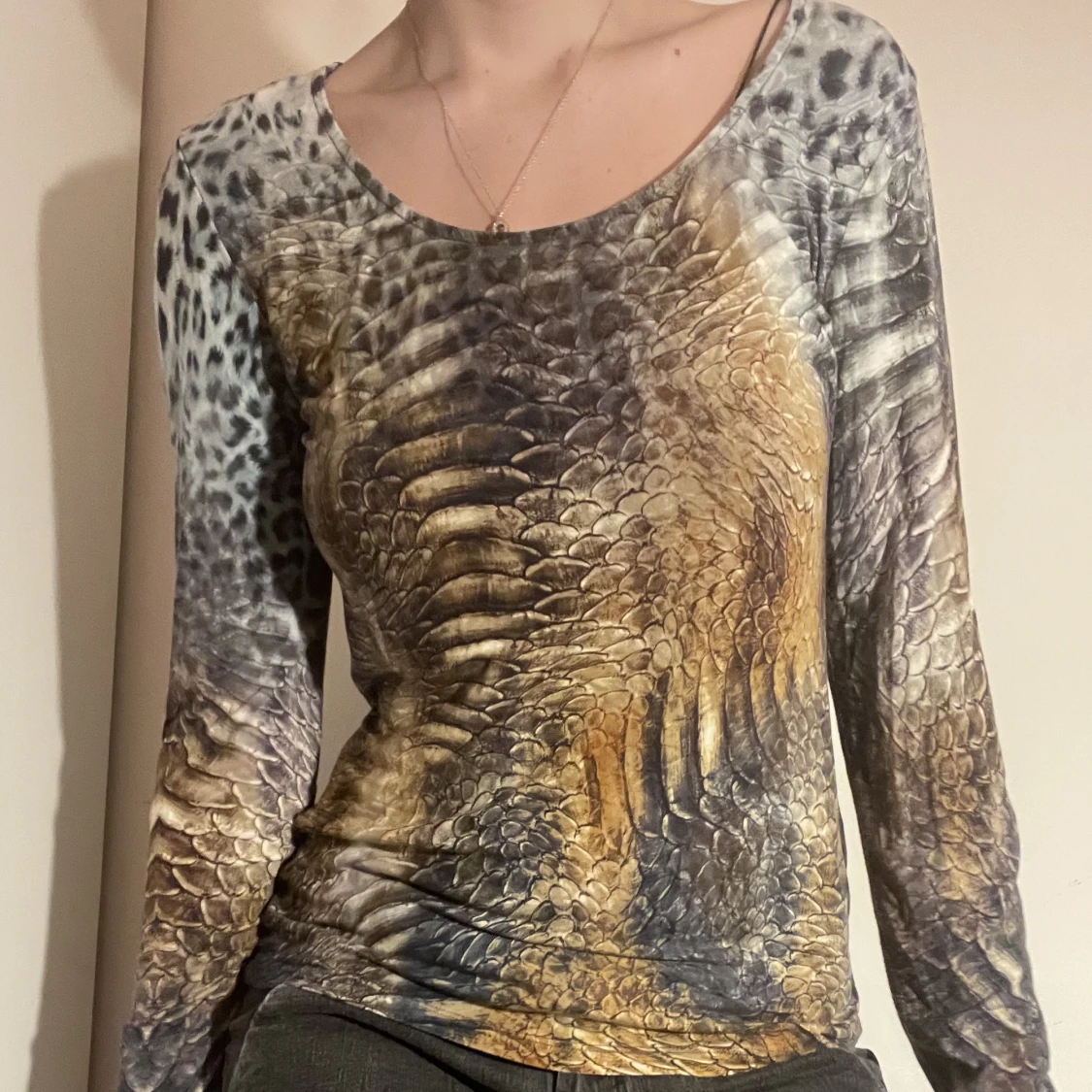 Så snygg långärmad tröja som skiftar i typ orm och leopardmönster, kommer tyvärr sällan till användning. Skönt stretchigt material, står ej storlek men passar mig som brukar ha s-m. Köpt second hand i Italien. Kan mötas upp nära Mariatorget eller posta.