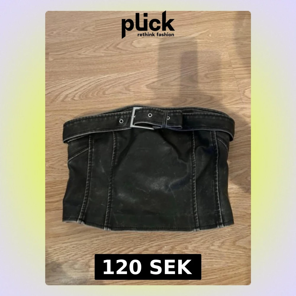 Cool svart topp i skinnimitation med bälte och silverfärgat spänne framtill. Aldrig använd, prislapp kvar!
