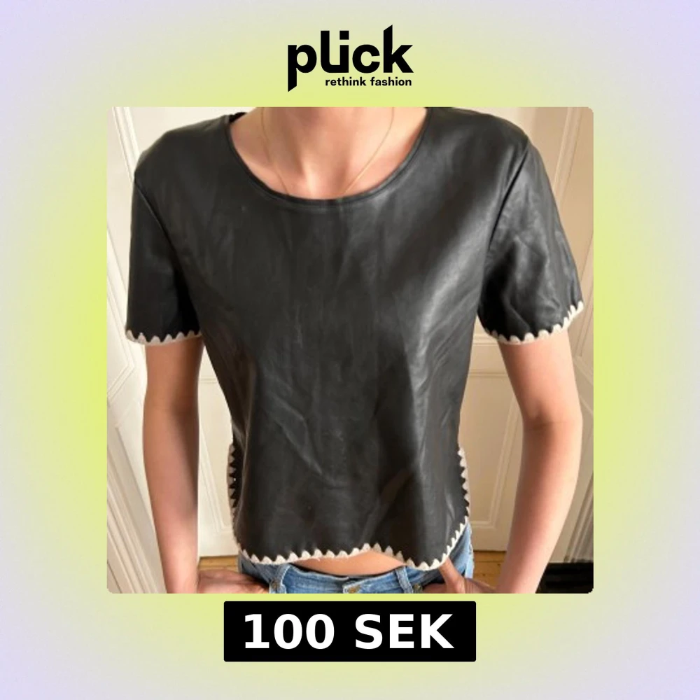Cool svart topp i skinnliknande material med korta ärmar och sicksack-detaljer längs sömmarna. Croppad så slutar lite under naveln. Är från Zara och i storlek M