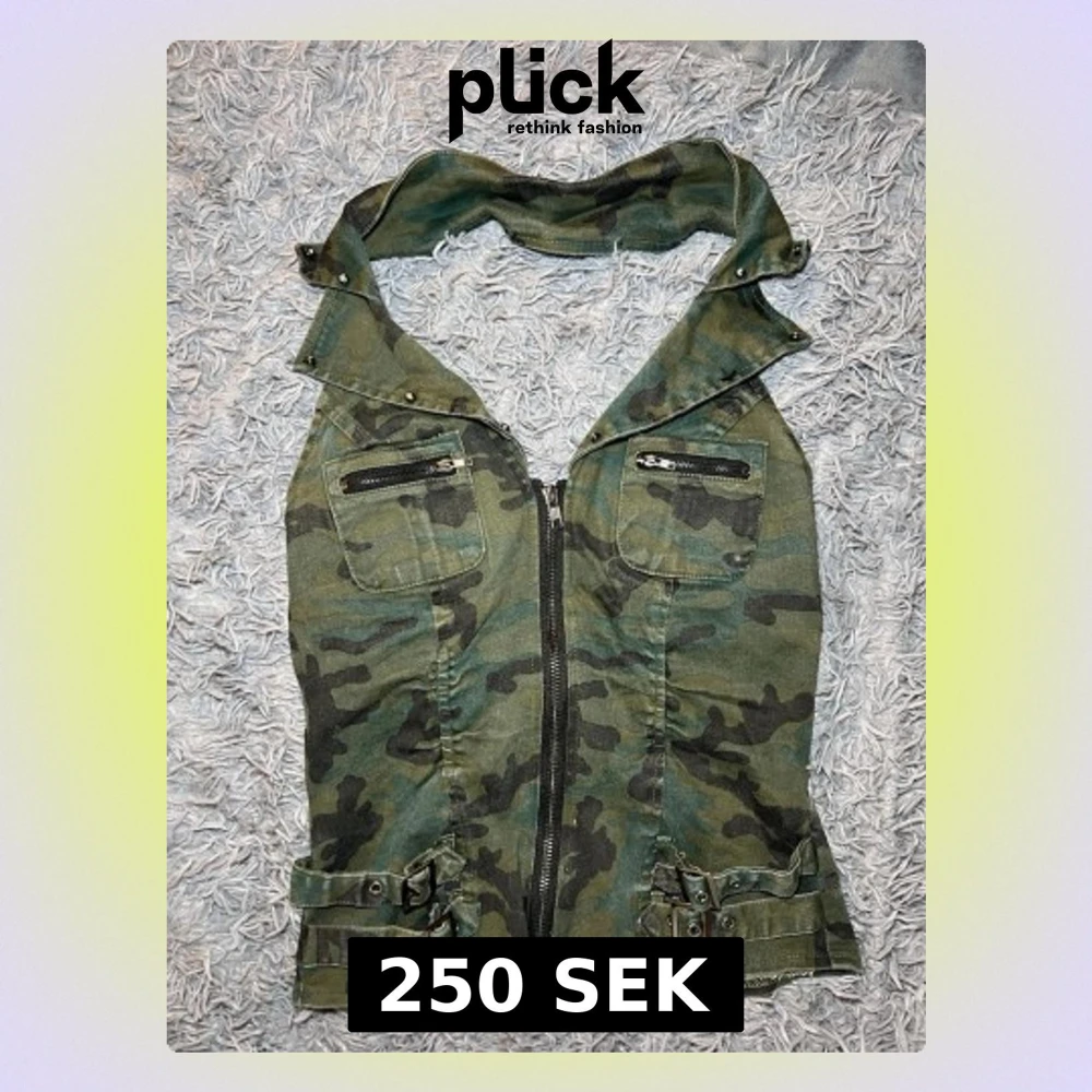 Säljer en grön camouflagetopp med coola detaljer som dubbla fickor med dragkedja på bröstet, bred krage med kristaller och justerbara bälten. Toppen har en hel dragkedja framtill och är gjord i ett slitstarkt bomullsmaterial. Perfekt för dig som gillar streetstyle. 95% bomull och 5% spandex