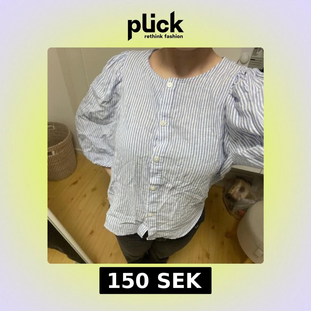 Säljer en blårandig blus med vita knappar framtill och rund halsringning. Blusen har trekvartsärmar med puff och resår vid ärmslut. Tillverkad i ett lätt och luftigt material, perfekt för vår och sommar. Klassisk och fräsch look som passar till jeans eller kjol.
