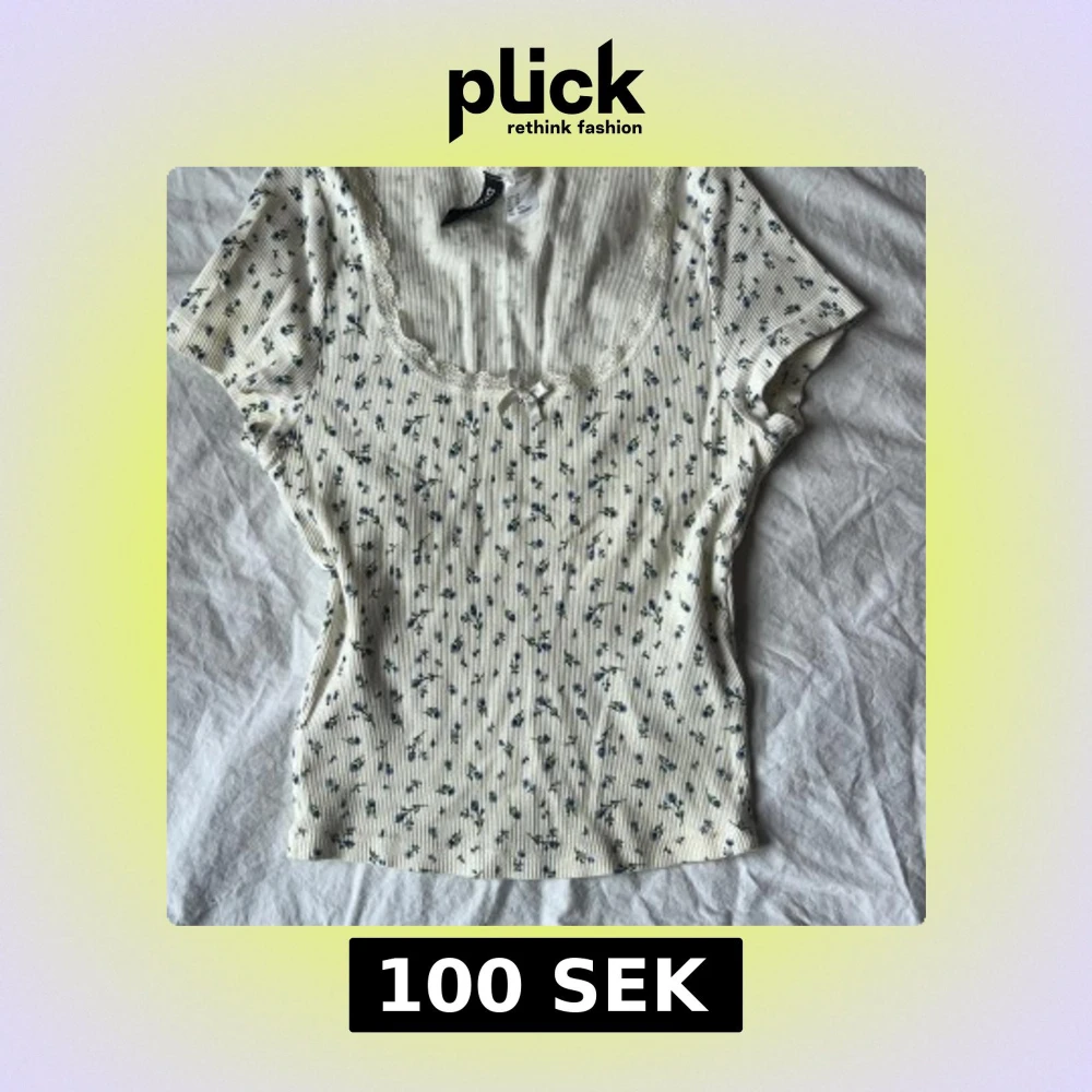 Söt vit topp från H&M med små blå blommor och ribbad struktur. Den har korta ärmar och spetsdetaljer vid halsringningen samt en liten rosett framtill. Passar xs-s🫶 använd ett fåtal gånger men inget som märks på den