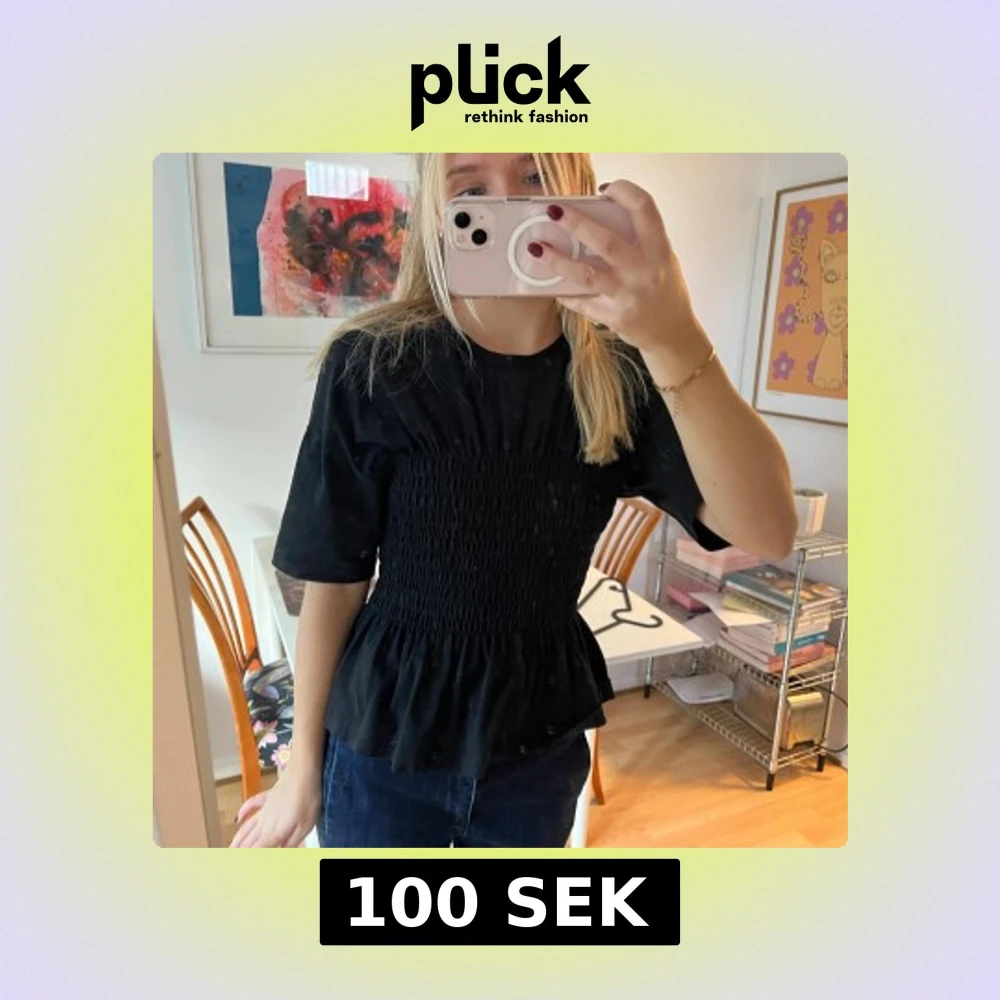 Svart blus med rund hals och halvlånga ärmar. Toppen har smockad midja som ger en snygg siluett och avslutas med en volangkant nedtill.
