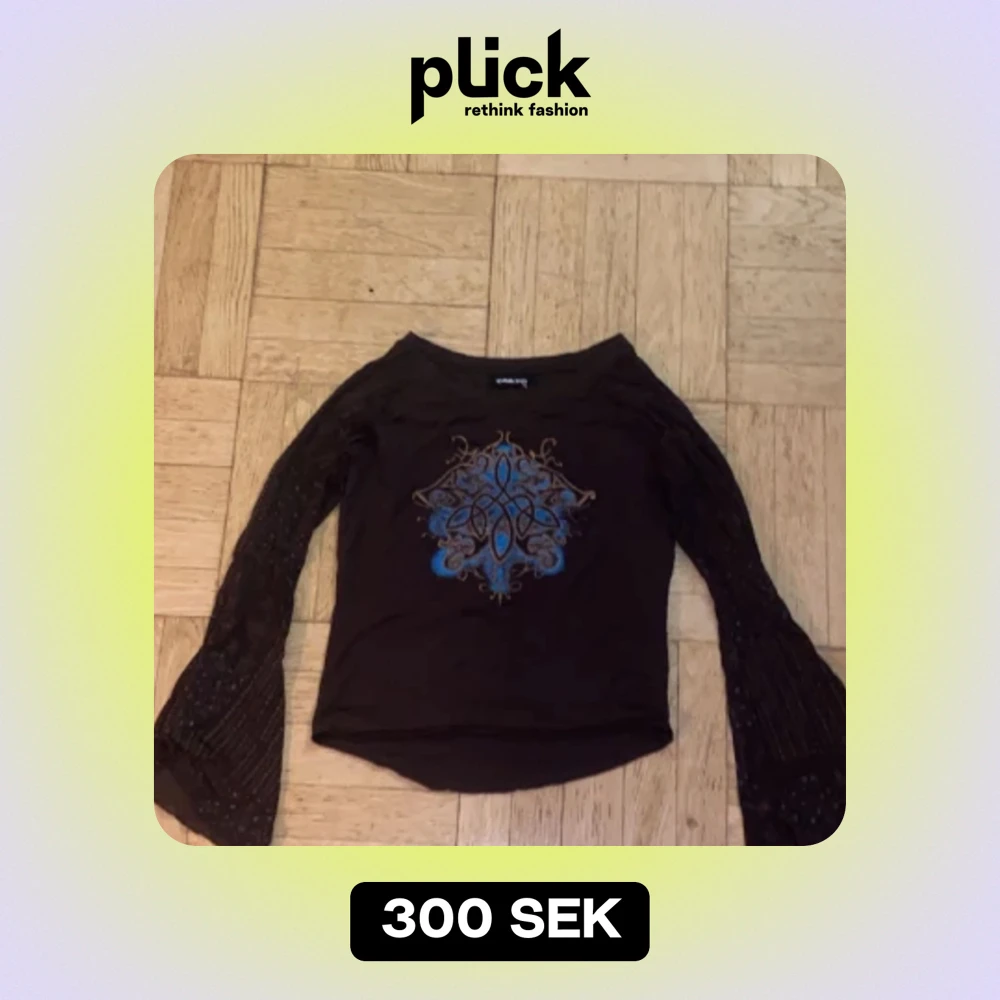 Otrolig brun tröja med vida mesh-ärmar. Coolt tryck på framsidan med blå-glittriga detaljer. Ärmarna har små blommiga mönster. Storlek S-M