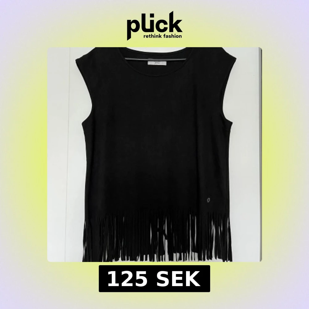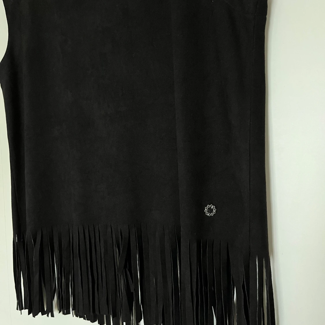 Svart ärmlös topp med fransar nedtill från Nümph i storlek M. Toppen har en rund halsringning och en liten dekorativ detalj på sidan. Mockaimmitation liknande material, 90% polyester och 10% elastan. Nyskick. Mått: Längd inklusive fransar ca 66 cm Byst ca 51 cm Midja ca 51 cm