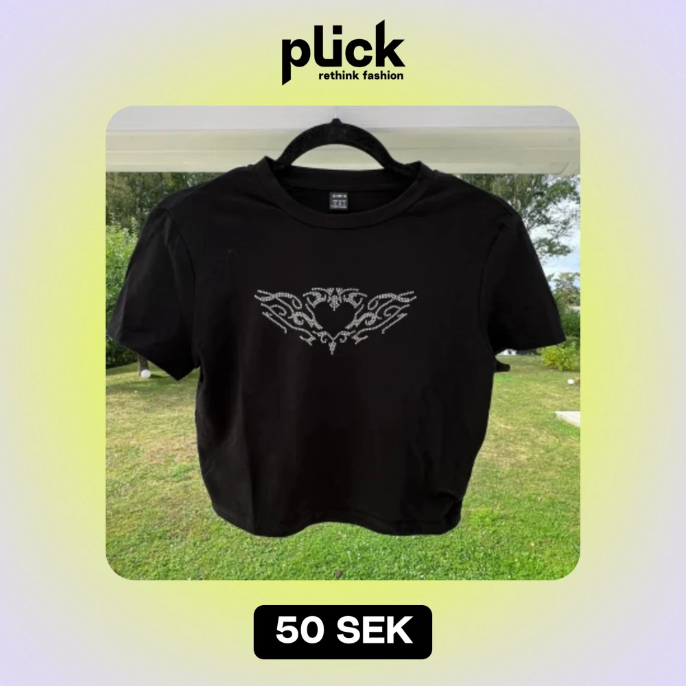 En svart crop top med strass i form av ett hjärta. Säljs pga att den aldrig blev använd 🤍 Passar mig bra som har storlek S 🥰 (ALDRIG ANVÄND) Längd: 44 cm Axel: 38 cm Byst: 83 cm