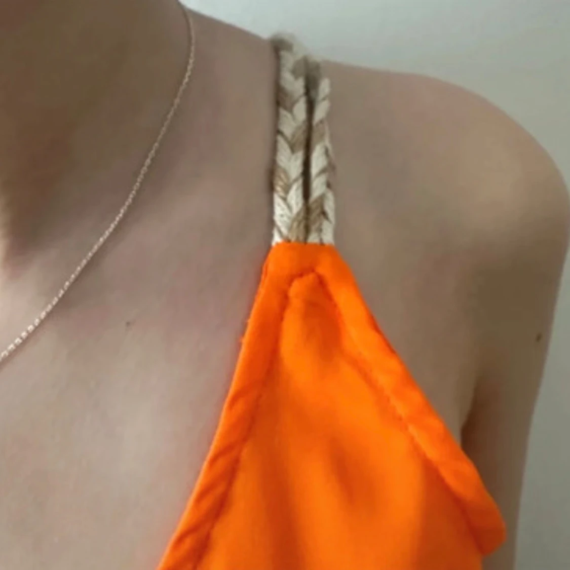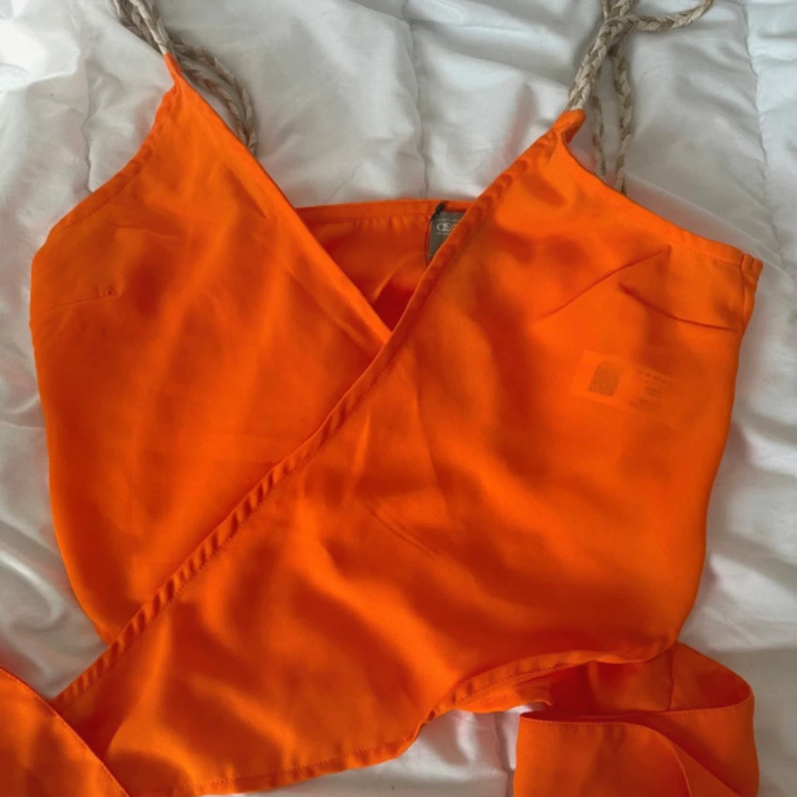 Snygg orange omlottopp från ASOS med croppad passform och knyt i midjan. Toppen har flätade naturfärgade axelband och djup v-ringning. Perfekt för dig som vill sticka ut med en färgstark look i sommar