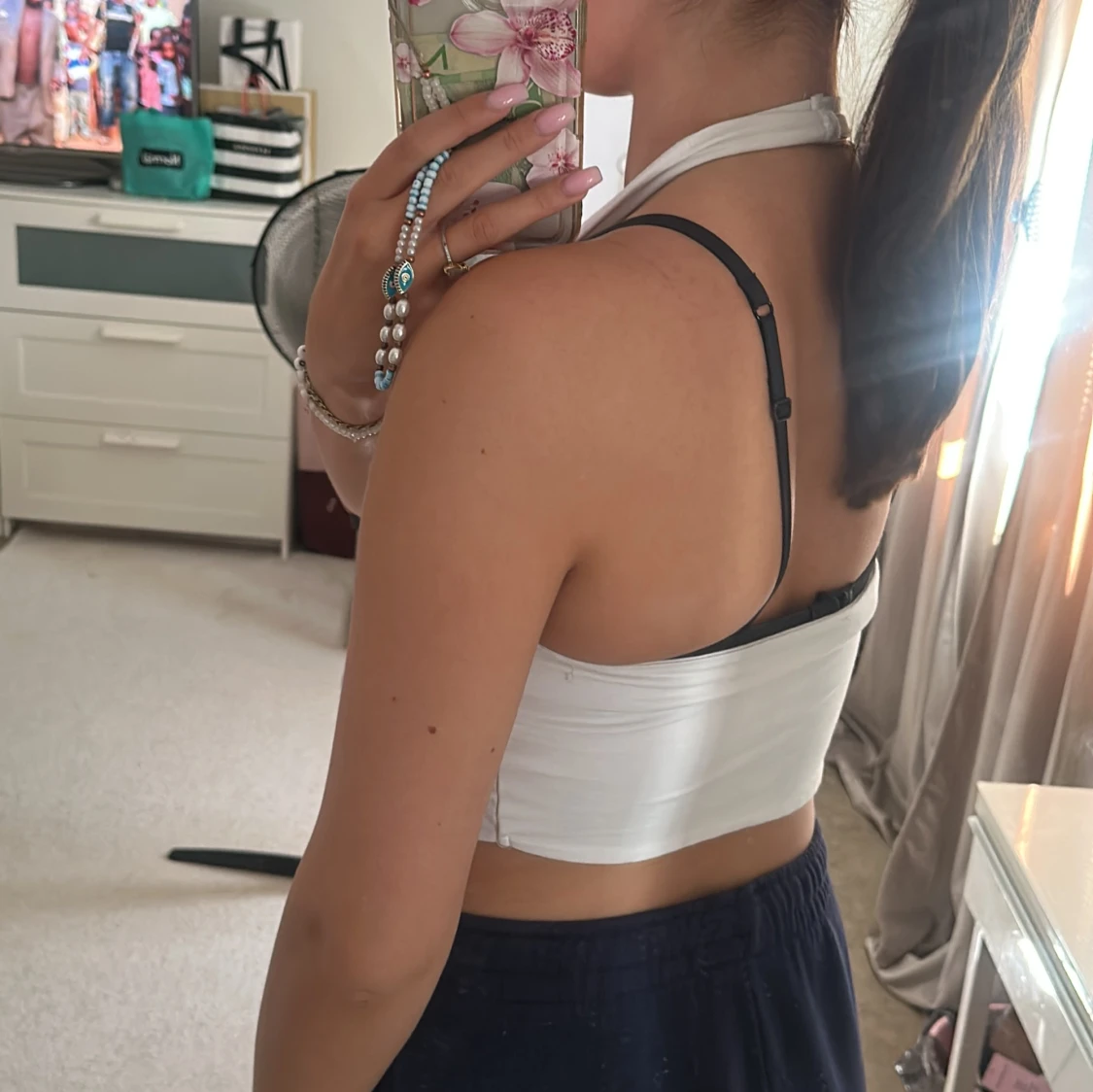 Säljer en vit croppad halterneck topp med omlott-skärning och djup v-ringning. Skit snygg till utgång men även i vardagen.