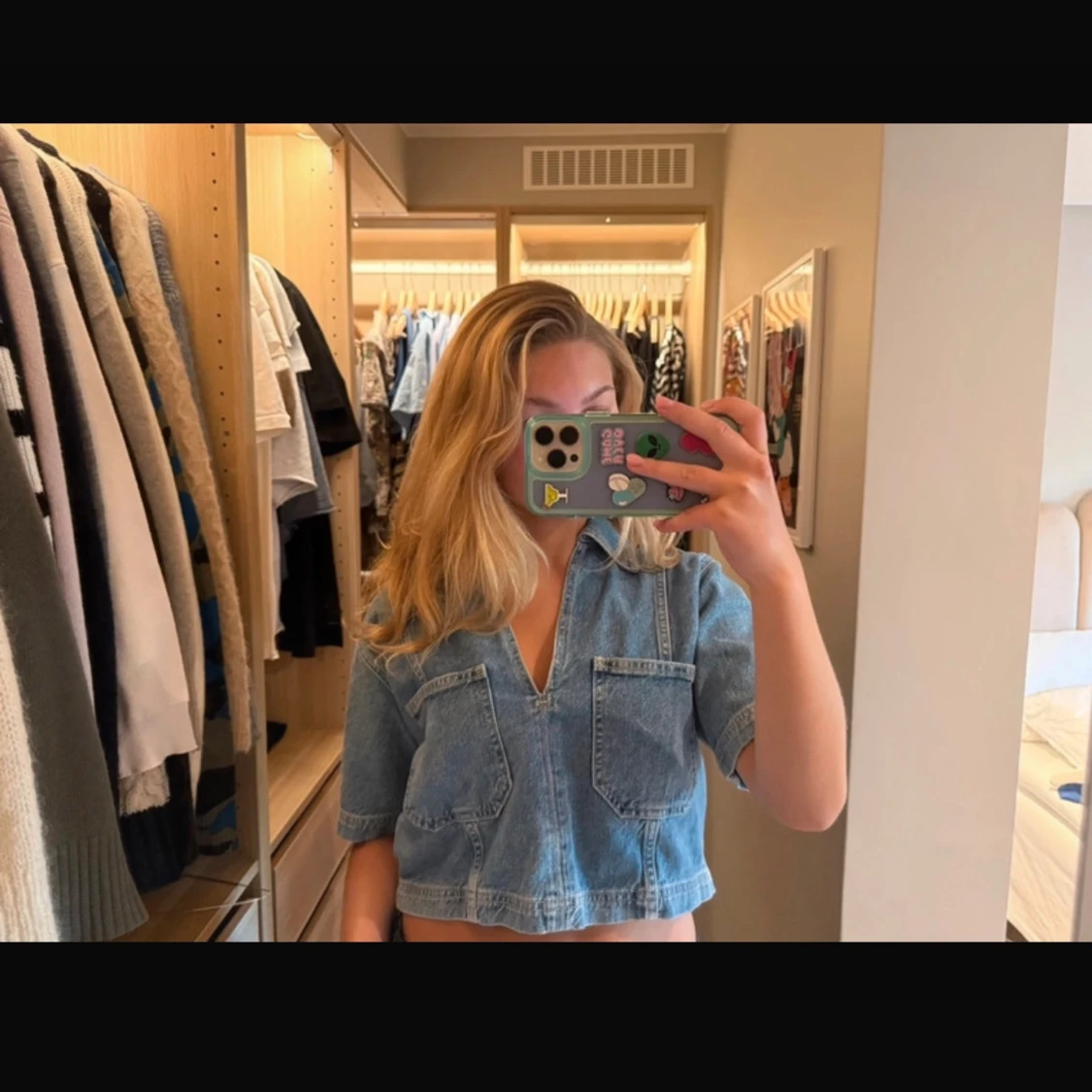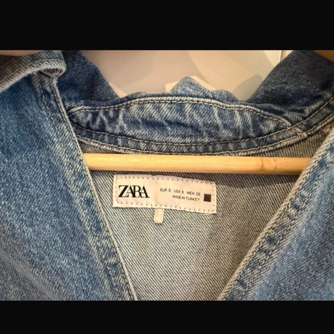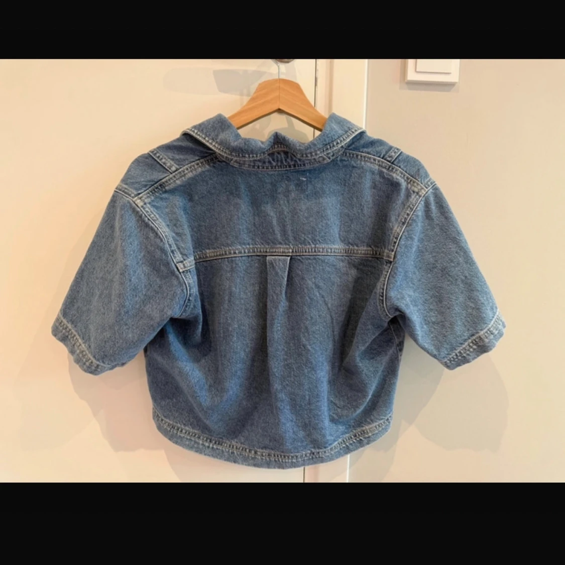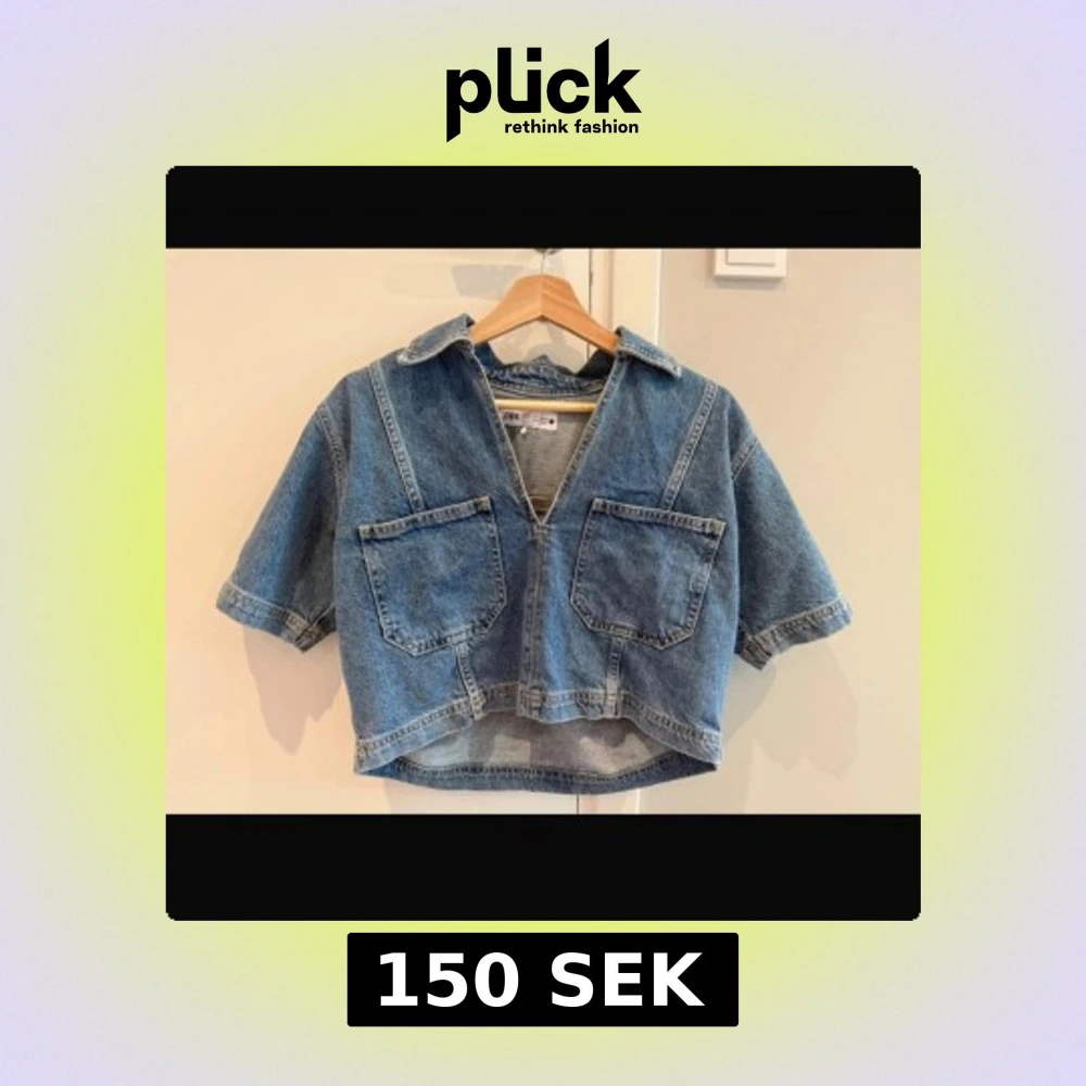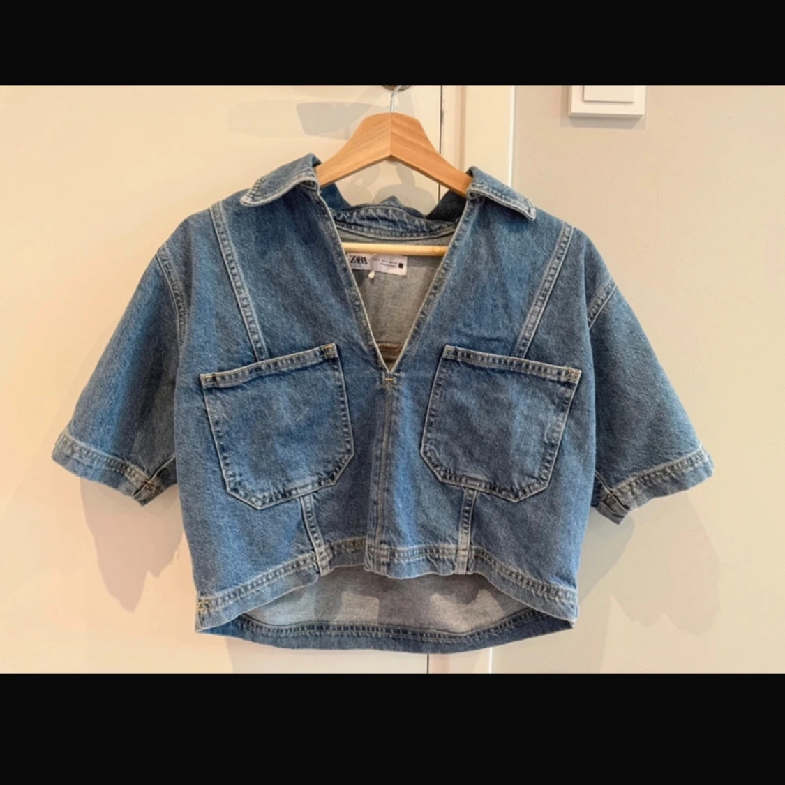 Säljer en croppad jeansblus från Zara i klassisk blå denim. Modellen har korta ärmar, två stora bröstfickor, krage och v-ringning med dragkedja framtill. Perfekt till ett par höga byxor för en cool look.