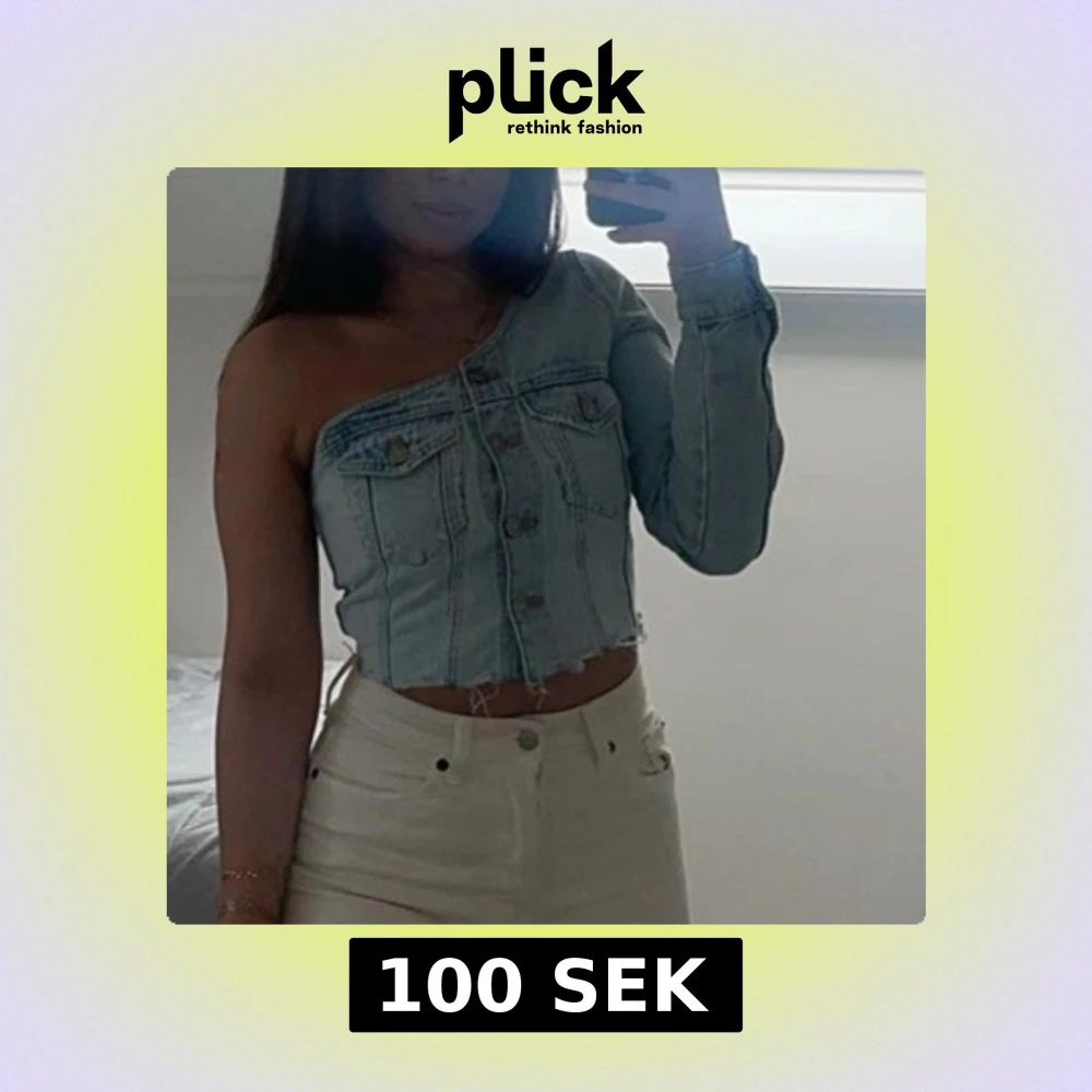 Säljer en ljusblå croppad bolerotopp i jeansmaterial med oneshoulder-design och lång ärm. Toppen har knappar framtill, rå kant nedtill och coola sömmar samt fickdetaljer på bröstet. Perfekt för dig som gillar unik stil och denim.