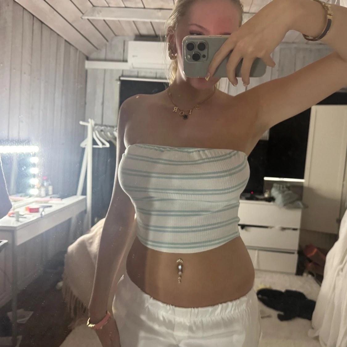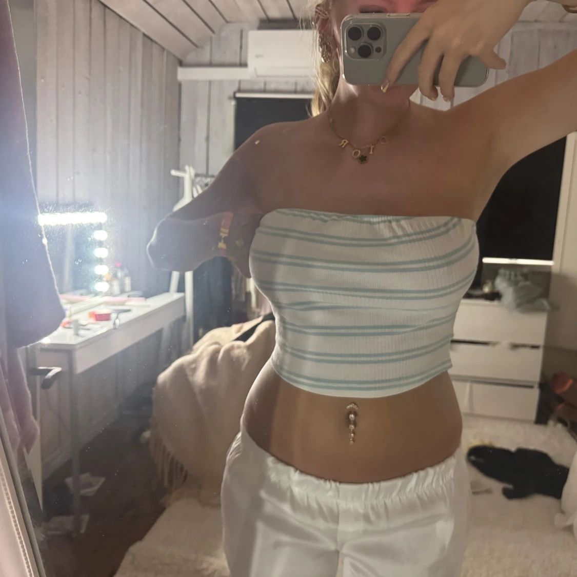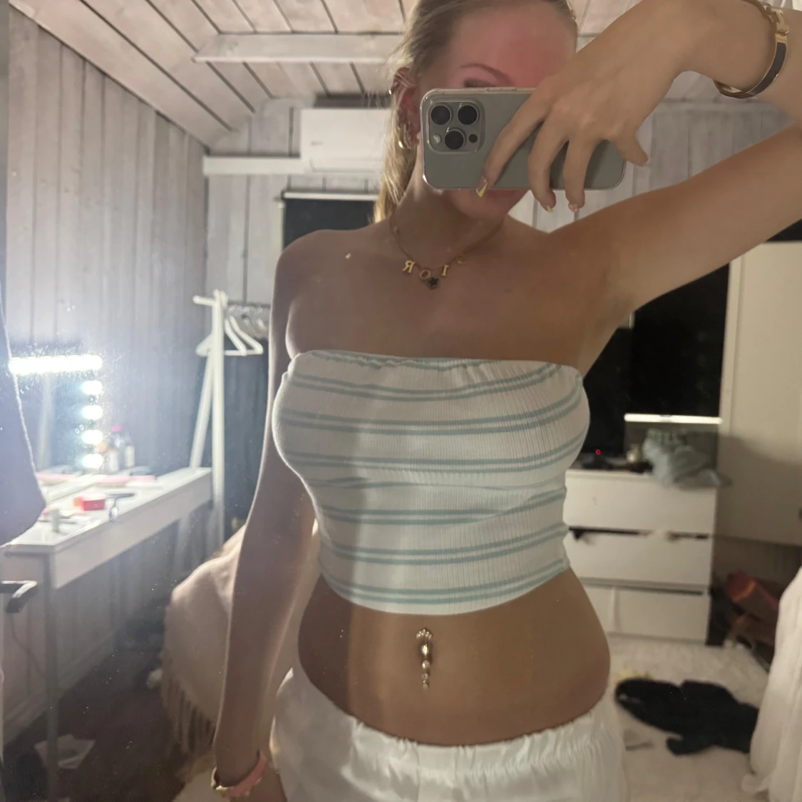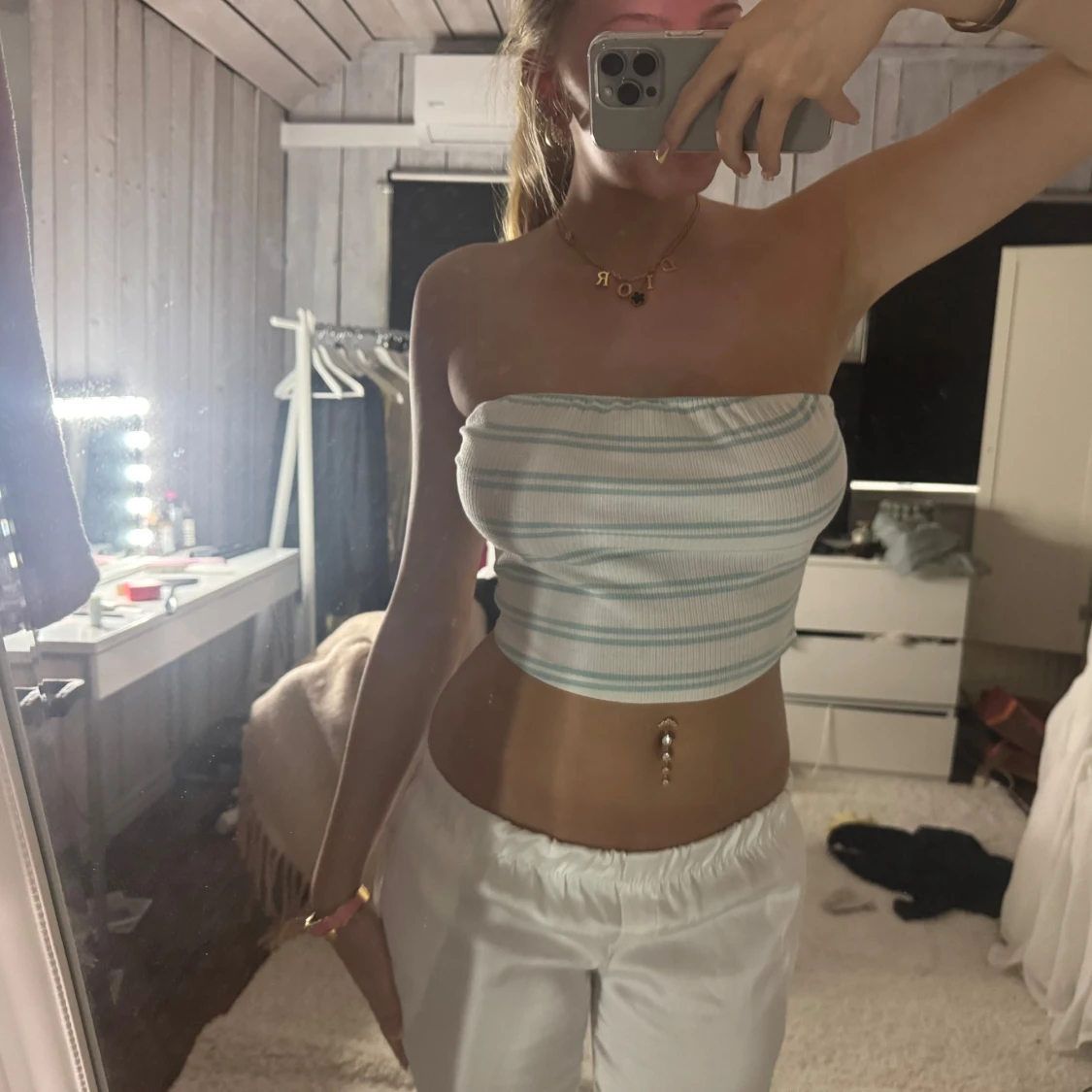 Säljer en bandeau tubtopp med ljusblå och vita ränder. Toppen är ribbad och ärmlös, perfekt för varma dagar. Den har en croppad passform och är superenkel att styla med både jeans och kjol. Materialet känns mjukt och stretchigt.