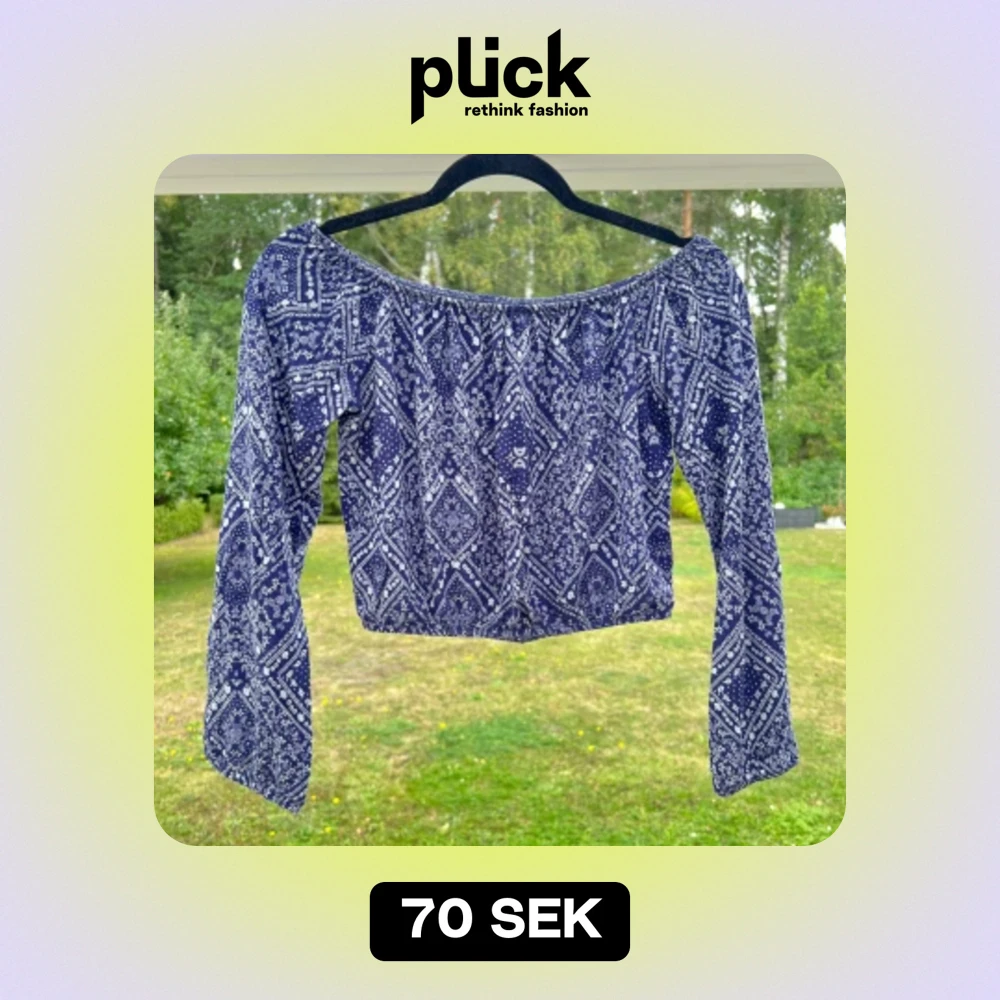 En croppad långärmad off-shoulder topp från H&M. Används inte längre 🌷 Jättestretchig med resår i både överkant och i ärmsluten. Använd max 5 gånger Längd: 29 cm Axel: 37 cm