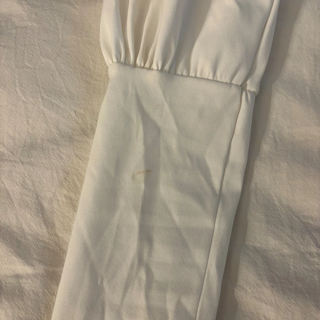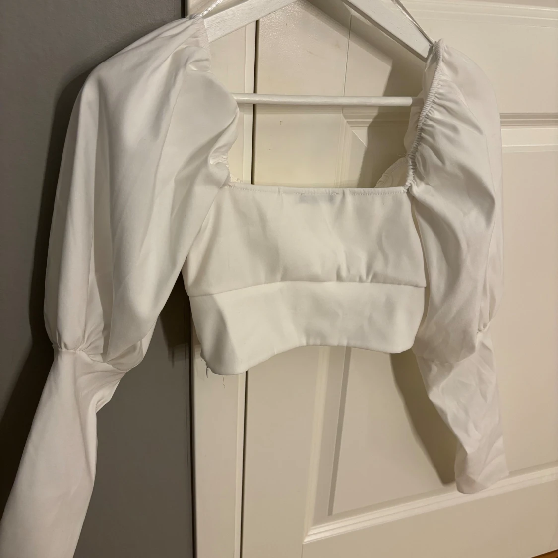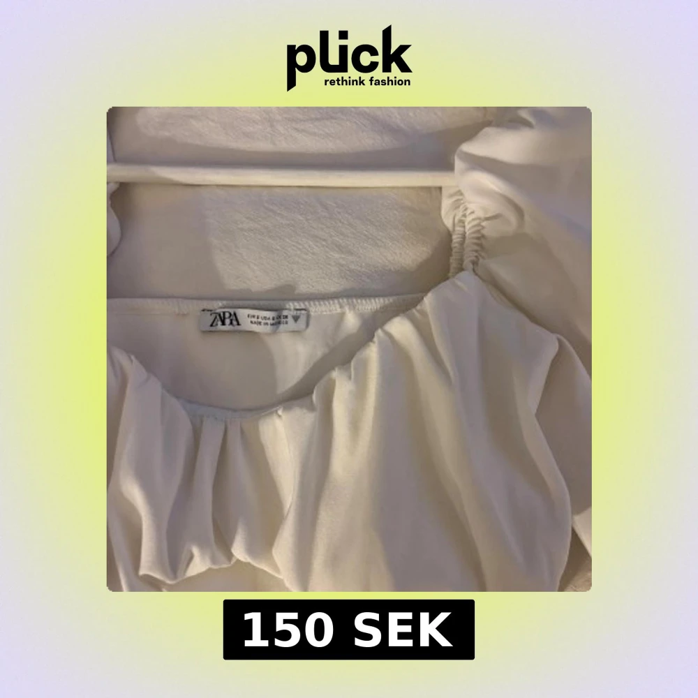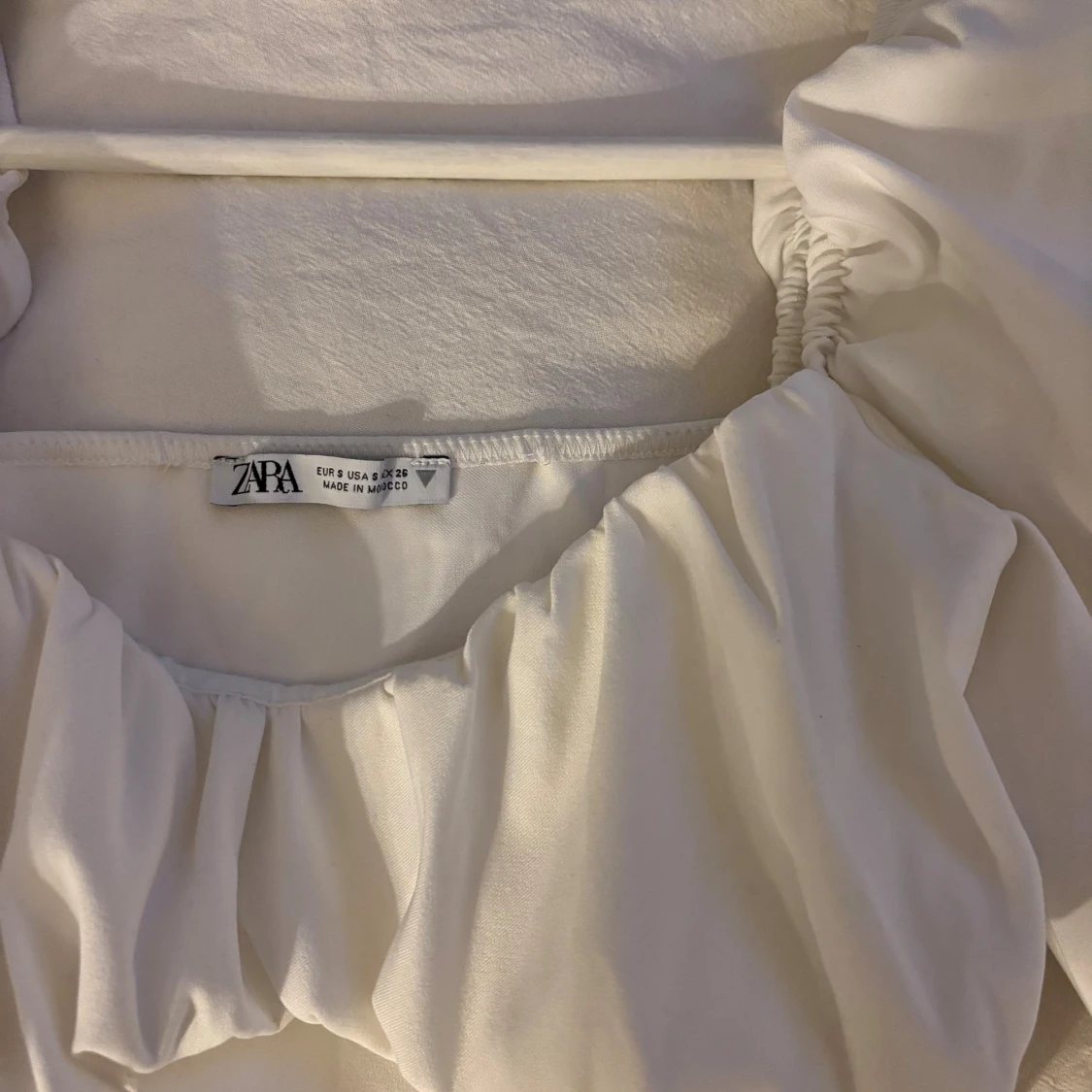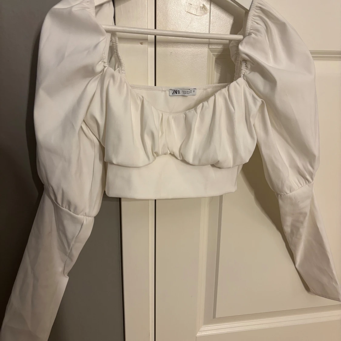Supersnygg vit blus från Zara med croppad passform och puffiga långärmar. Toppen har en fyrkantig urringning och rynkade detaljer framtill som ger en cool och trendig vibe. Perfekt att styla med höga jeans eller kjol för en chic look. Finns en liten fläck som ni ser på sista bilden, går säkert bort i tvätten men lovar inget.