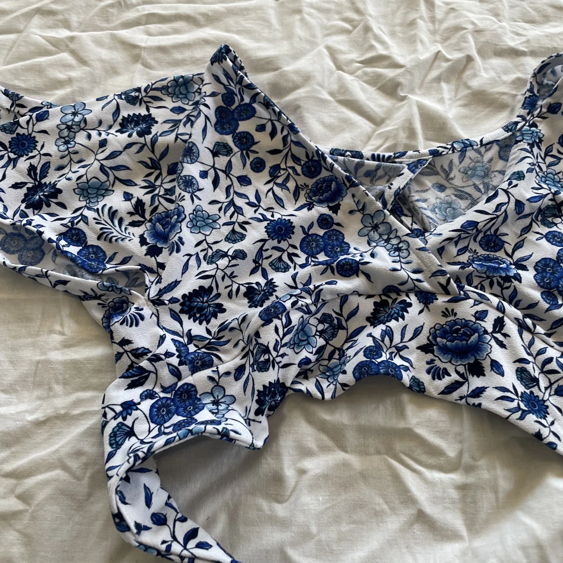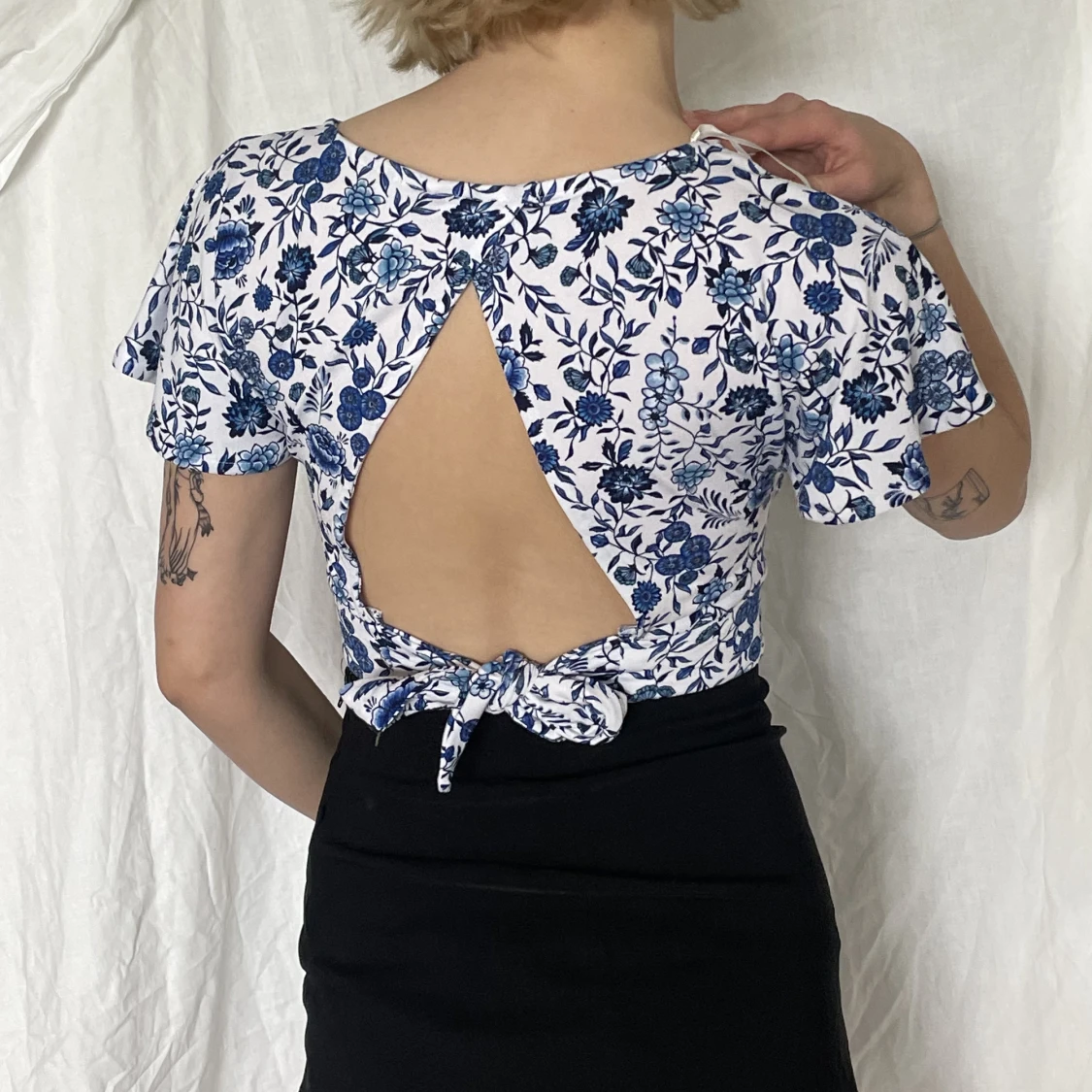 Blå, vit blommig crop topp med bar rygg där man knyter baksidan själv. Väldigt fin men inte min stil längre