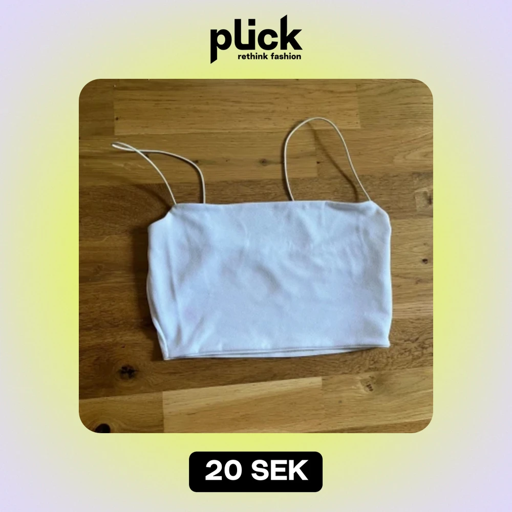 Vit crop top som sitter tight mot kroppen. Passar bäst om man har lite mindre bröst. Jag kan ha den som har M, men det är knappt. Rekommenderar den om man har S. Har en fläck på baksidan men det ska säkert gå bort i tvätten eller med lite Vanish.