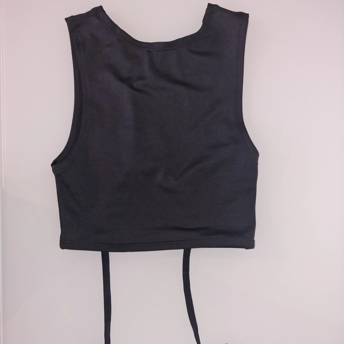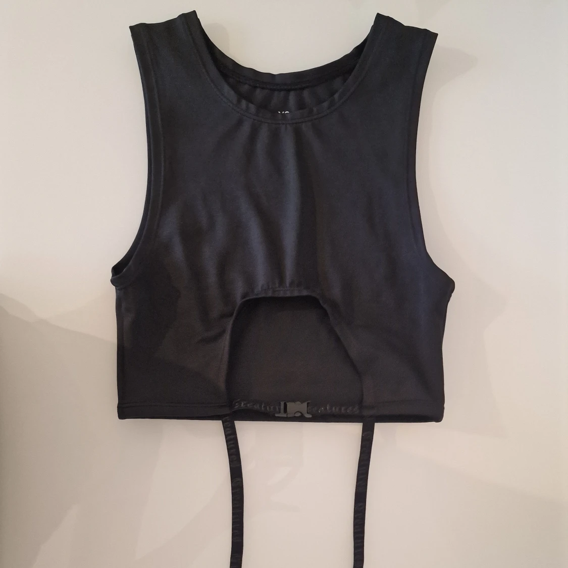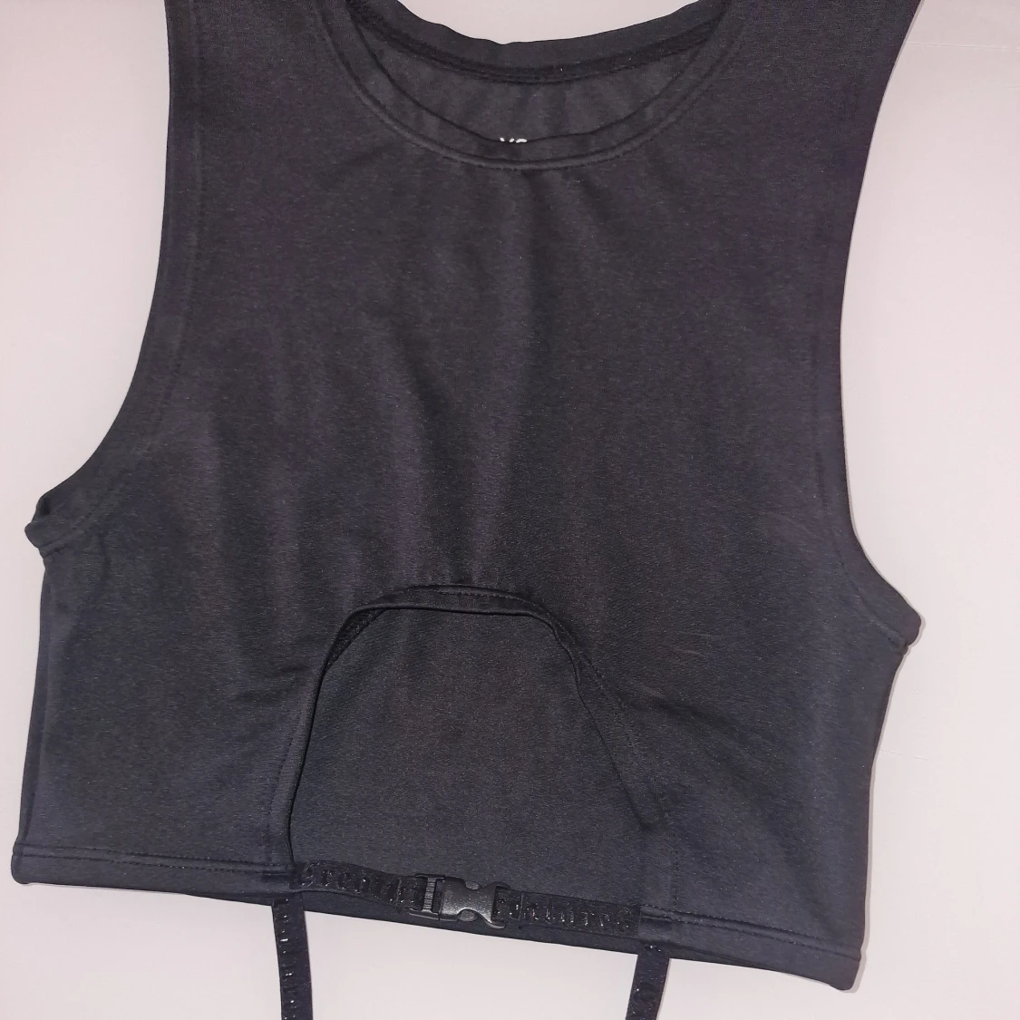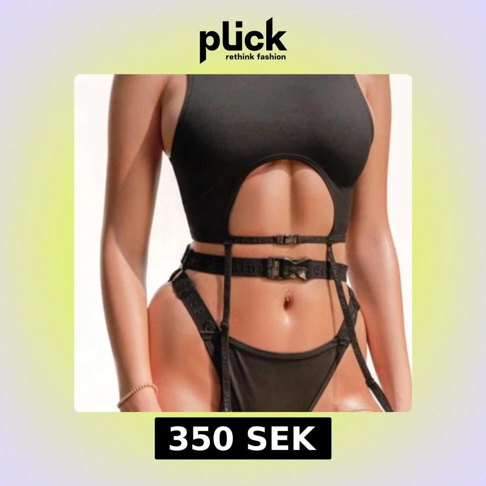 Svart topp med cut-out framtill och justerbara strumpebandshållare med spännen runt midjan. Snygg till träning/dans och även som bikini. Helt ny och oanvänd.