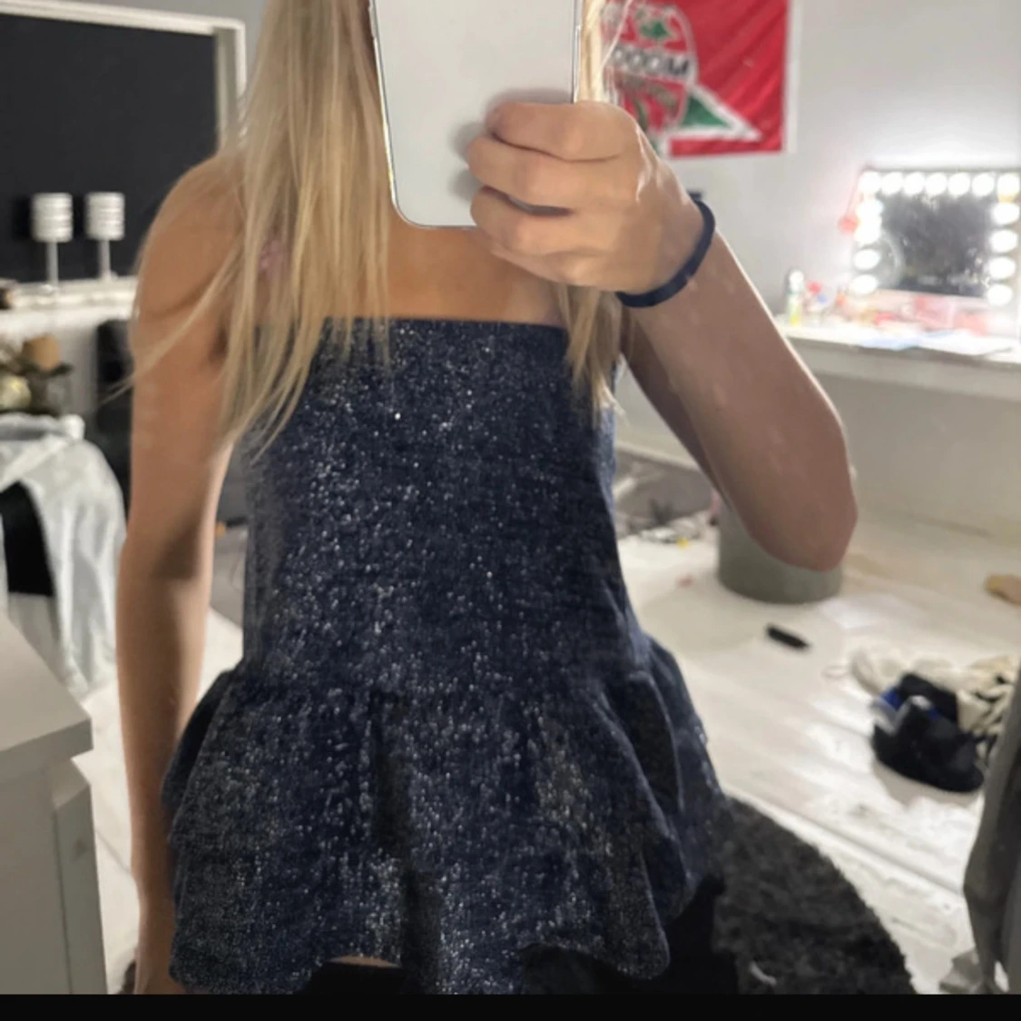 Säljer en glittrig mörkblå tubtopp med volangkant nertill. Toppen är axelbandslös och har en snygg bandeau-form som sitter tight över bröstet. Perfekt för dig som vill sticka ut med lite extra glitter.