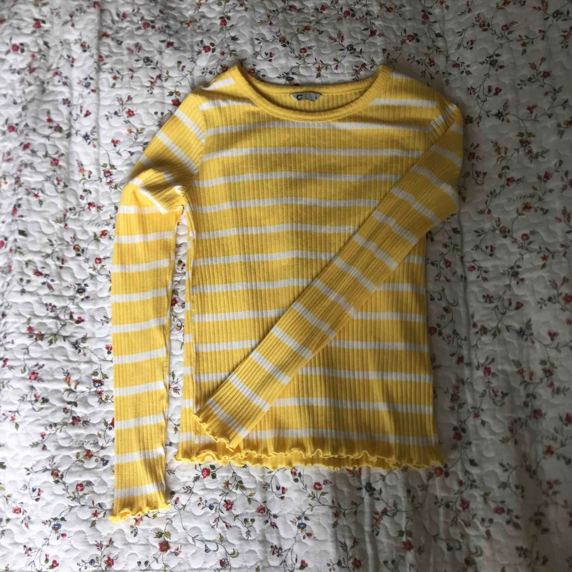 Tight randig långärmad i gult och vitt. Använd väldigt få gånger. Fina små volanger vid ärmarna och i slutet på tröjan. Frakt tillkommer.