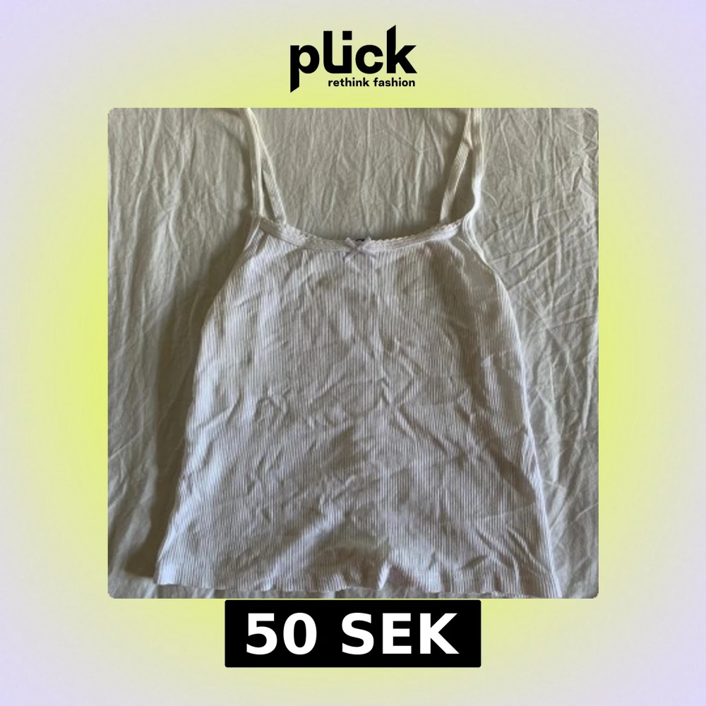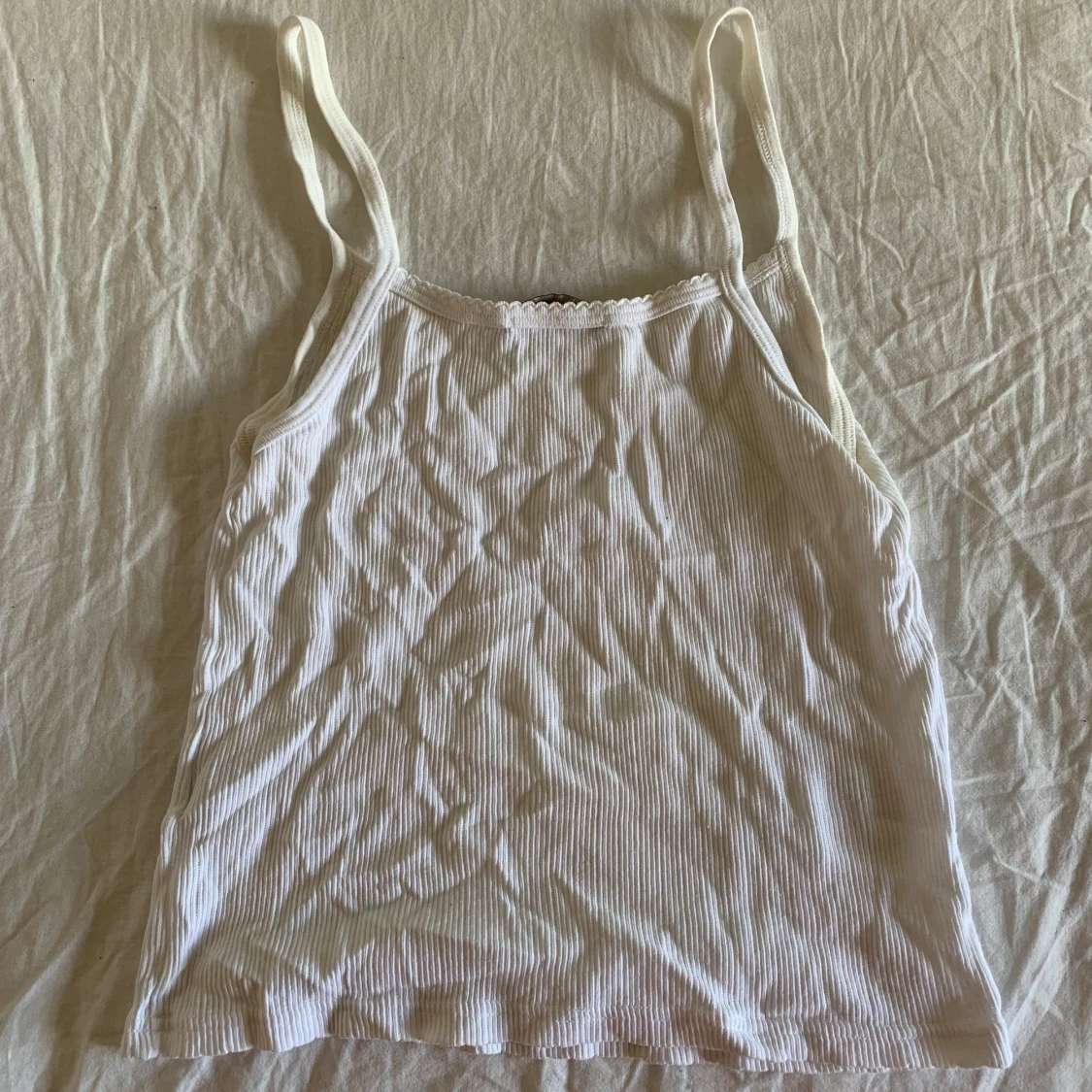 Supersöt vit ribbad linnetopp från Brandy Melville med tunna axelband och liten rosett framtill. Toppen har en smal passform och är perfekt för varma dagar. Diskret spetskant upptill ger en extra gullig touch.