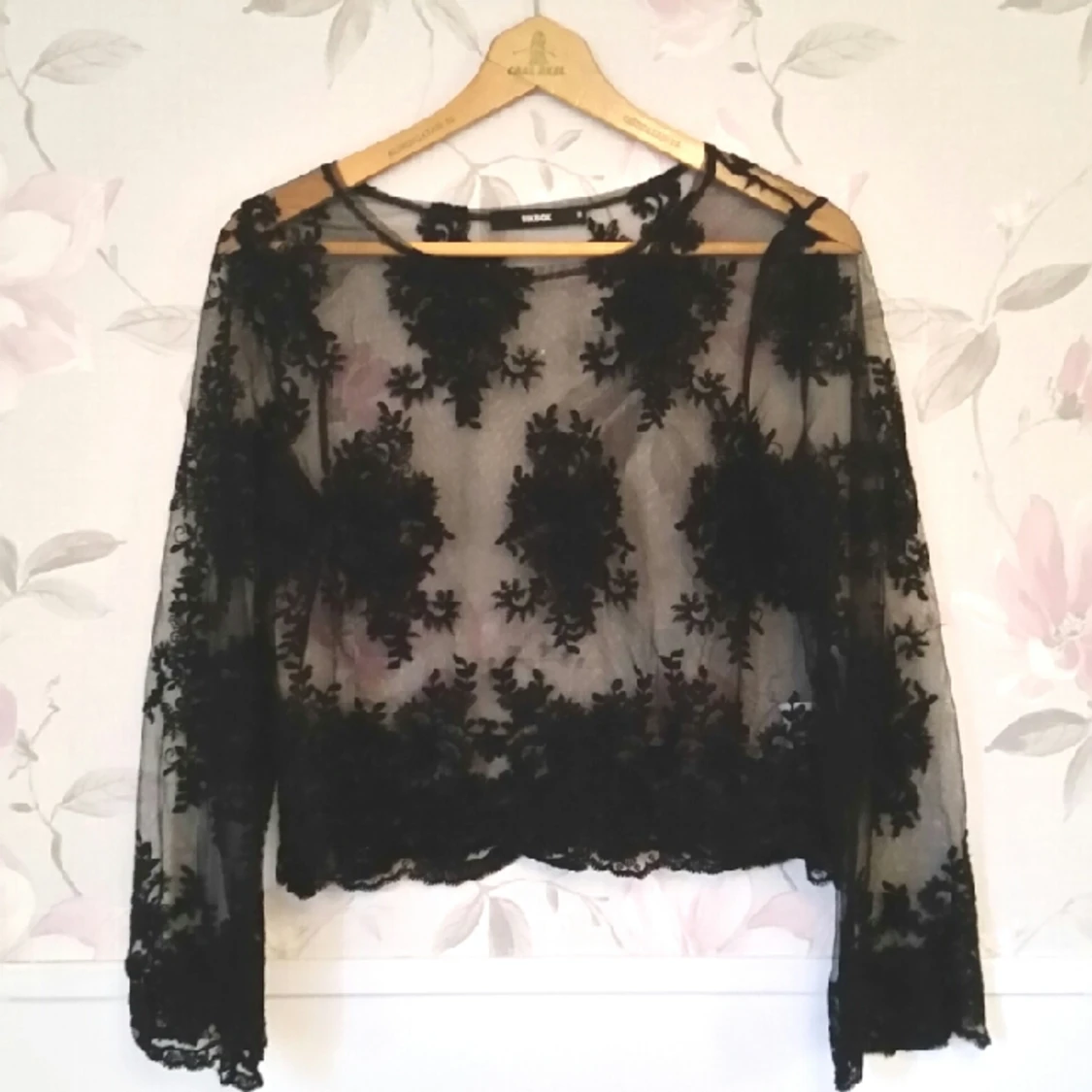 svart broderad från bikbok. Inte magtröja men slutar precis under naveln/där jeansen börjar. Färgen: Genomskinlig svart. Storlek M.