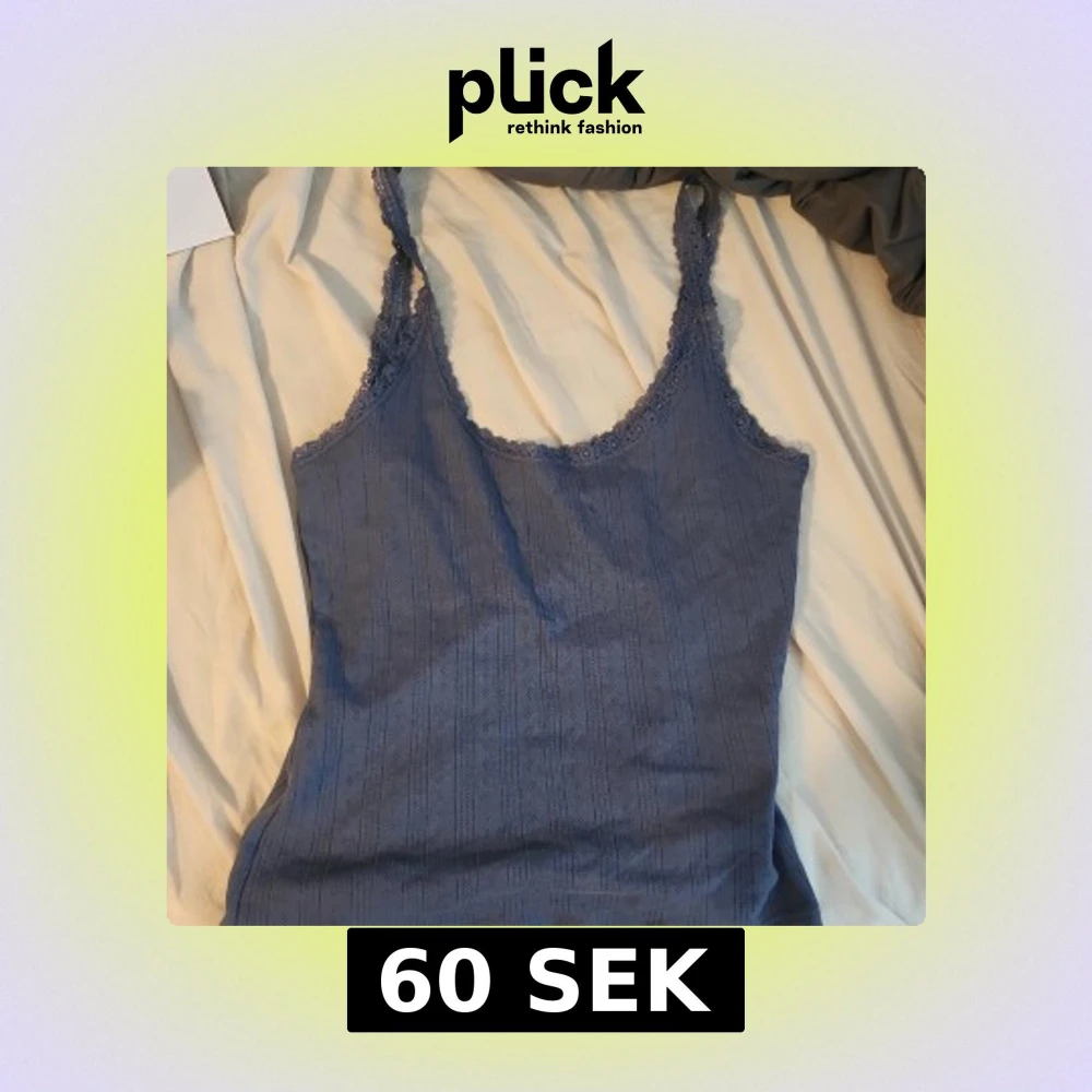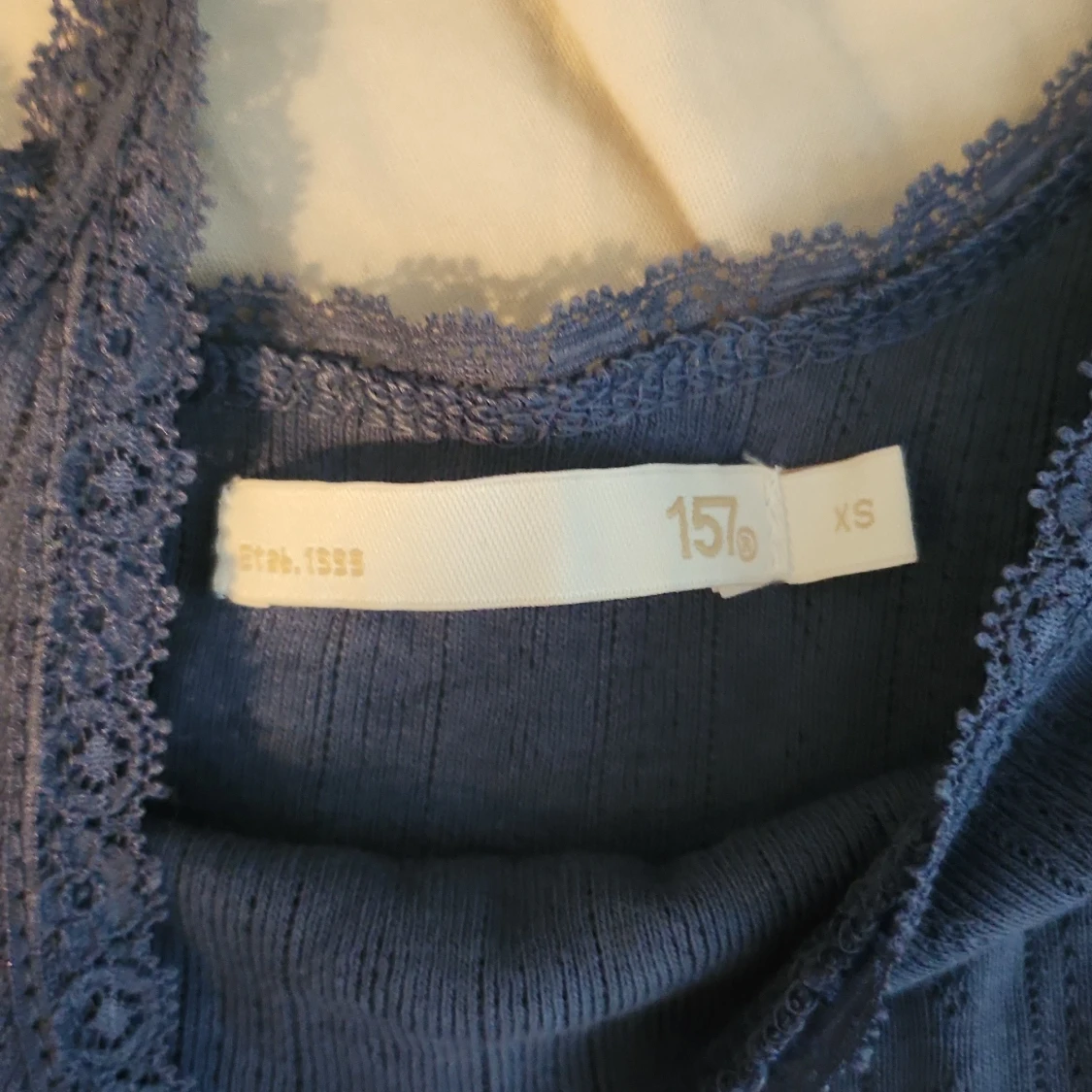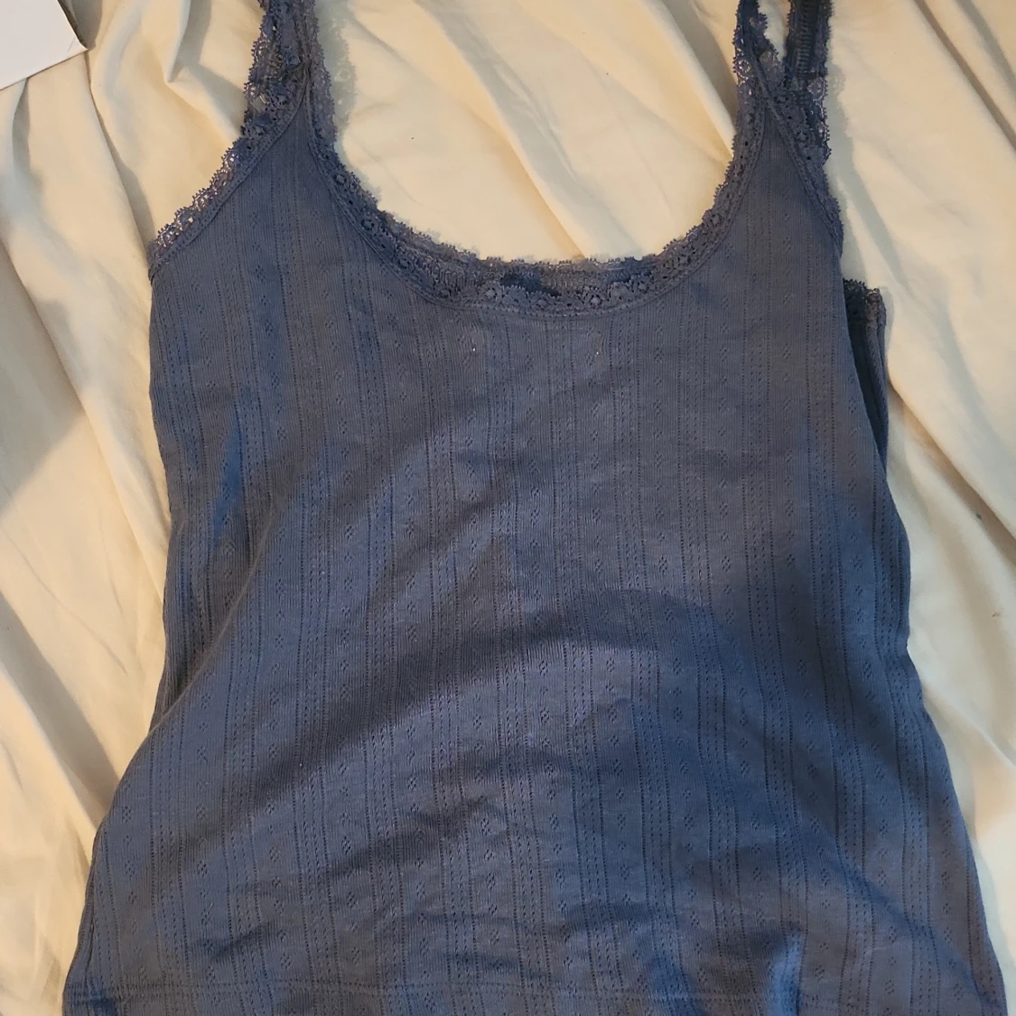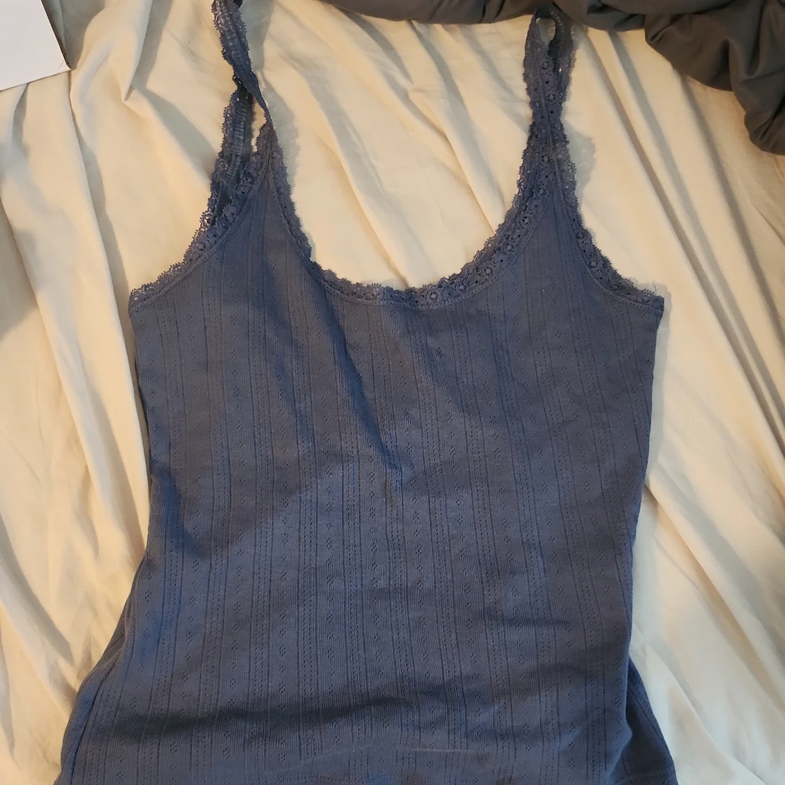 Supersöt blå linnetopp från 157. Toppen har smala axelband och fina spetsdetaljer längs kanterna. Materialet är ribbat med diskret mönster som ger en extra touch. Perfekt för att styla lager på lager eller till jeansshorts. Köpt på vinted. Säljer för den var förstor. Det står xs men den va lite förstor på mig som normalt har S. Rekommenderas för S-M.