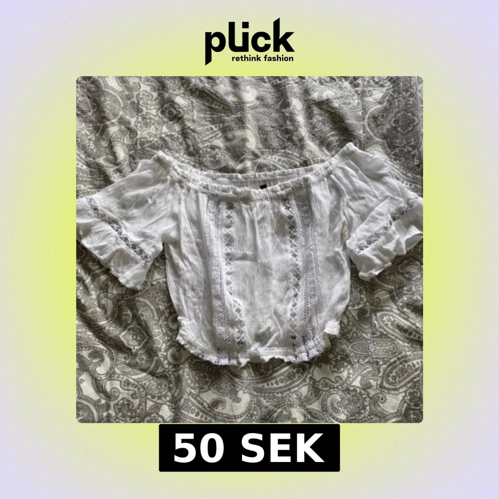 Superfin vit croppad blus från H&M Divided med offshoulder-modell och volangdetaljer på ärmarna. Blusen har spetsdetaljer framtill och är perfekt för sommardagar. Luftigt material och snygg passform.