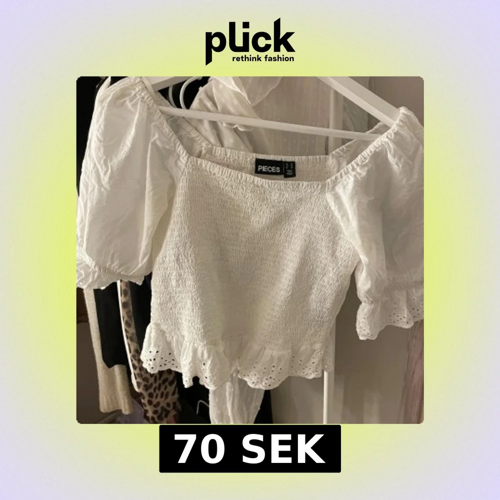 Säljer en söt vit offshoulder topp från Pieces med puffiga ärmar och volangdetaljer. Toppen har en smockad design och är perfekt för sommardagar. Passar bra till både jeans och kjol. 🌸Är även inte använd men ingen prislapp kvar.