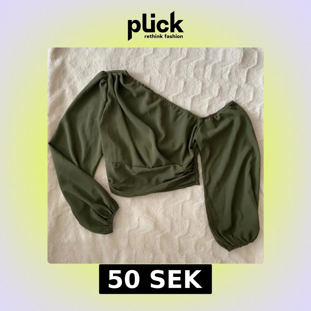 Säljer en olivgrön offshoulder topp från SHEIN med långa puffärmar och smockad midja. Toppen har en snygg asymmetrisk design och är tillverkad i ett lätt syntetmaterial. Perfekt för dig som vill ha en trendig och bekväm look.
