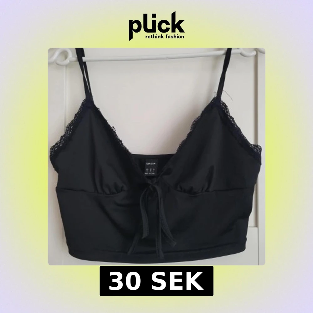 Snygg svart linnetopp från Shein med spetsdetaljer och knytning framtill. Perfekt för en stilren look. Tillverkad i ett mjukt material med smala axelband.