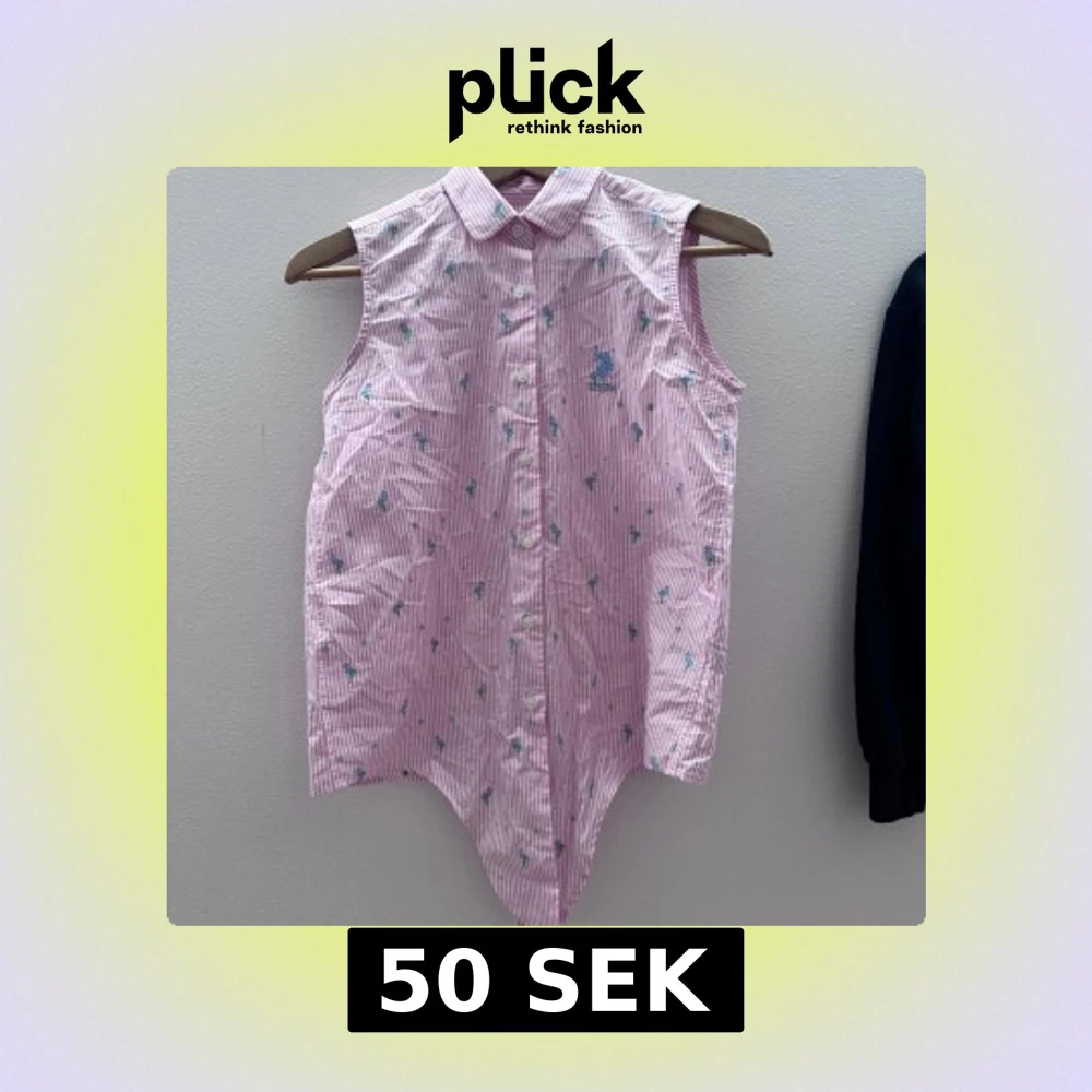 Söt rosa ärmlös blus med vita ränder och små blå blommor. Blusen har en klassisk krage och knappar framtill samt en knytning vid nederkanten för en avslappnad look.