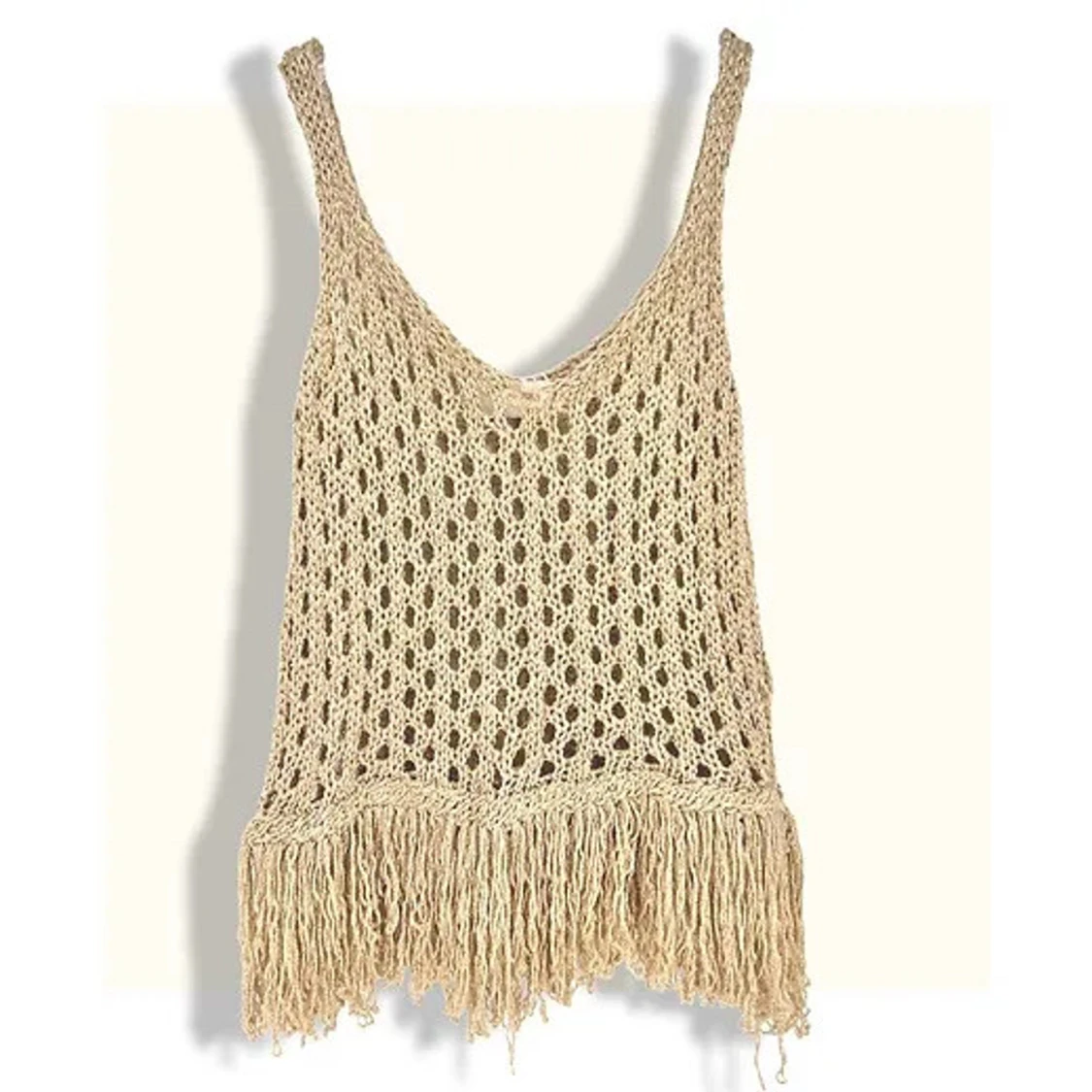 Säljer en guldig virkad linne med fransar i nederkant. Perfekt för sommardagar med sin luftiga design och djupa urringning. Ett måste för festivaler eller strandhäng! Står ingen storlek men passar mig som har S! Använt 1 gång, inga defekter!