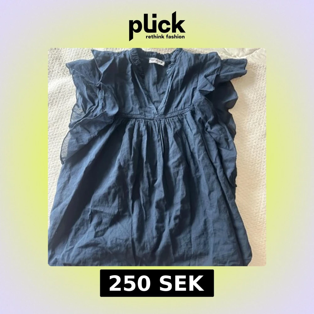 Säljer en mörkblå blus från Meet Me There i storlek S/M. Blusen har v-ringning, volangdetaljer längs ärmarna och är tillverkad i ett lätt och luftigt tyg. Perfekt för vår och sommar!