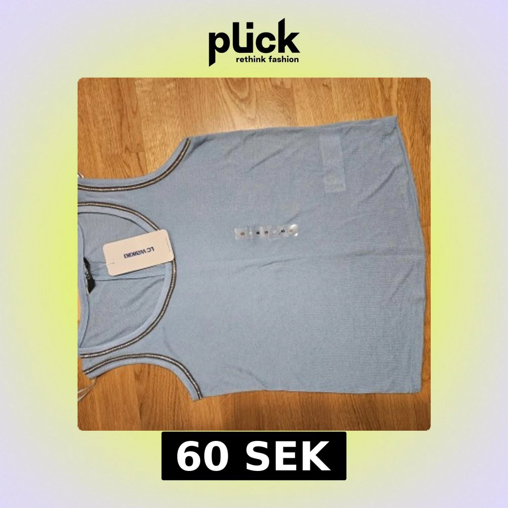 Säljer en ljusblå ärmlös linnetopp från LC Waikiki. Toppen har silverfärgade kantdetaljer runt halsringning och ärmhål samt små dekorativa knappar framtill. Perfekt för varma dagar och enkel att matcha.