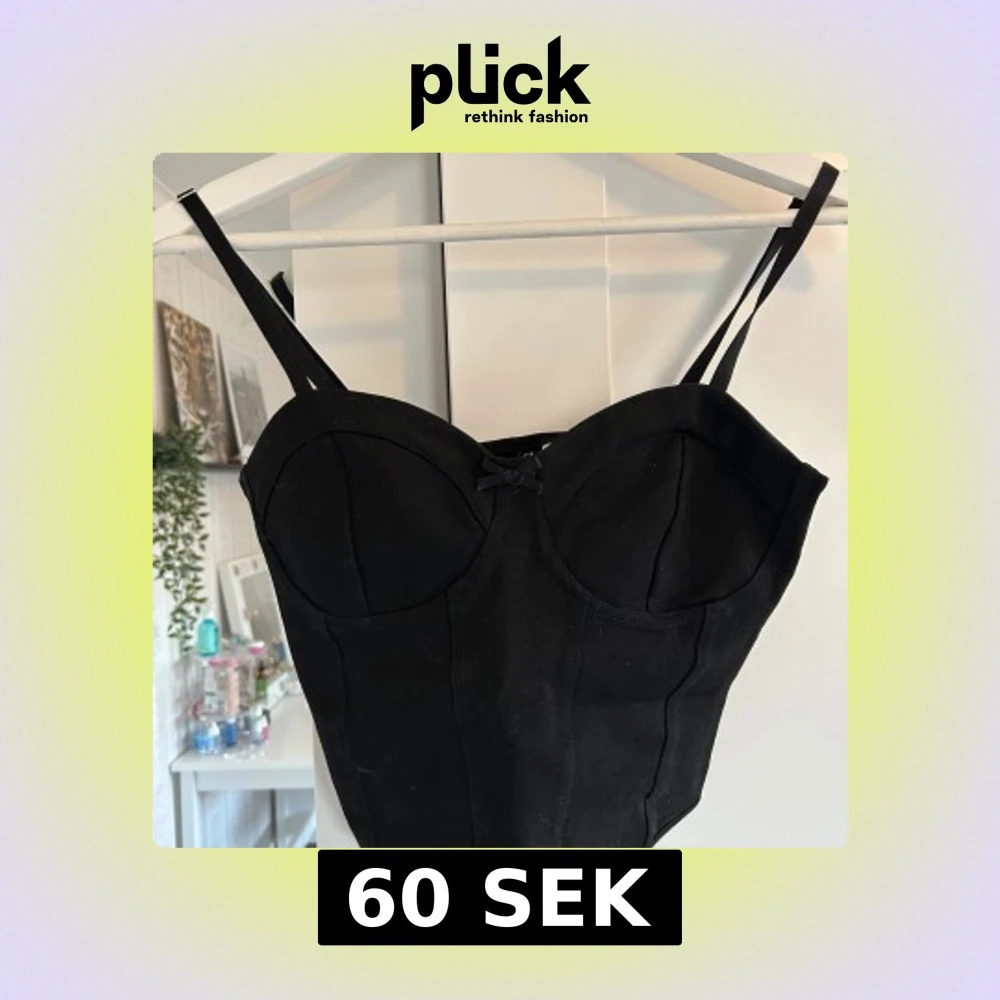 Snygg svart korsettopp från H&M Divided med smala axelband och markerade kupor. Toppen har en liten rosett framtill och är tillverkad i en stretchig viskosblandning som sitter tight och formar kroppen.