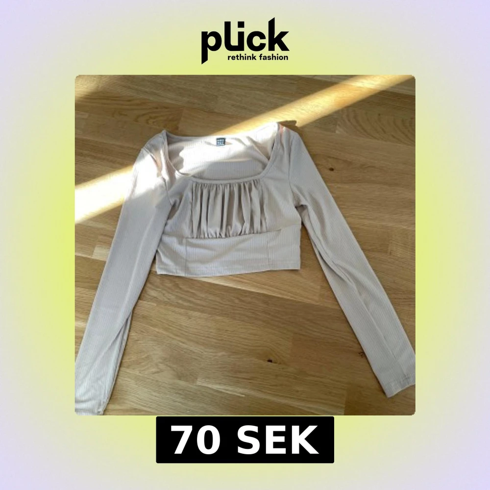 Säljer en beige ribbad topp från Shein med långa ärmar och en snygg rynkad detalj framtill. Perfekt för en stilren look. Toppen är i storlek S och har en croppad passform.