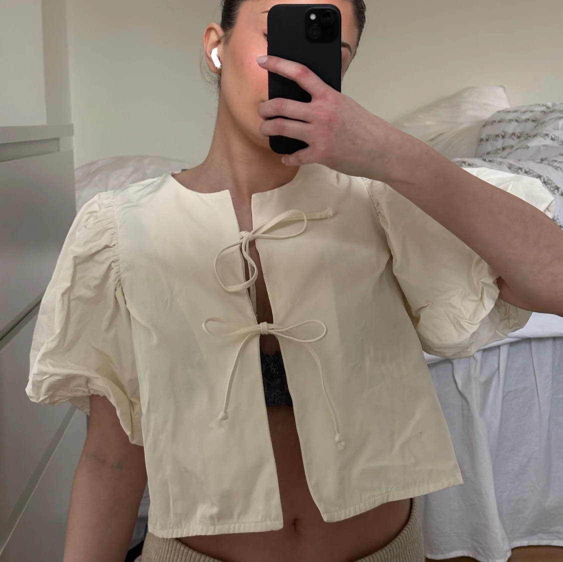 Säljer en söt beige blus med korta puffärmar och knytning framtill. Perfekt för en avslappnad och stilren look. Blusen är croppad och har en luftig passform. Helt ny aldrig använd