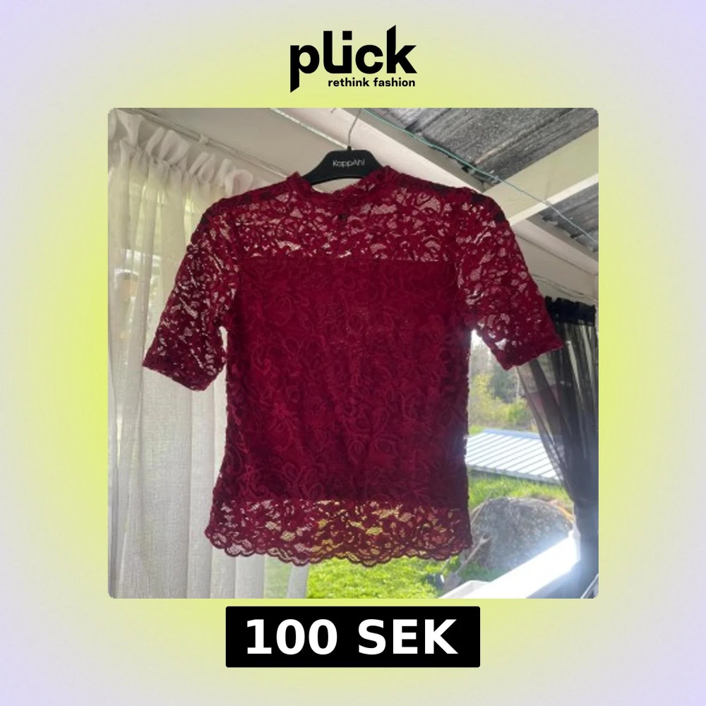 Säljer en vinröd blus från Divided med vackert blommigt spetsmönster. Blusen har korta ärmar och hög hals, perfekt för att lyfta en outfit med lite extra detaljer.