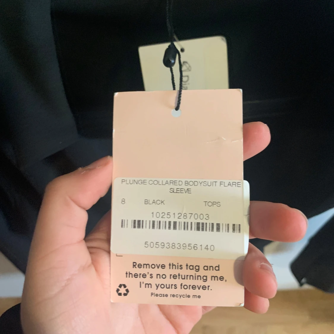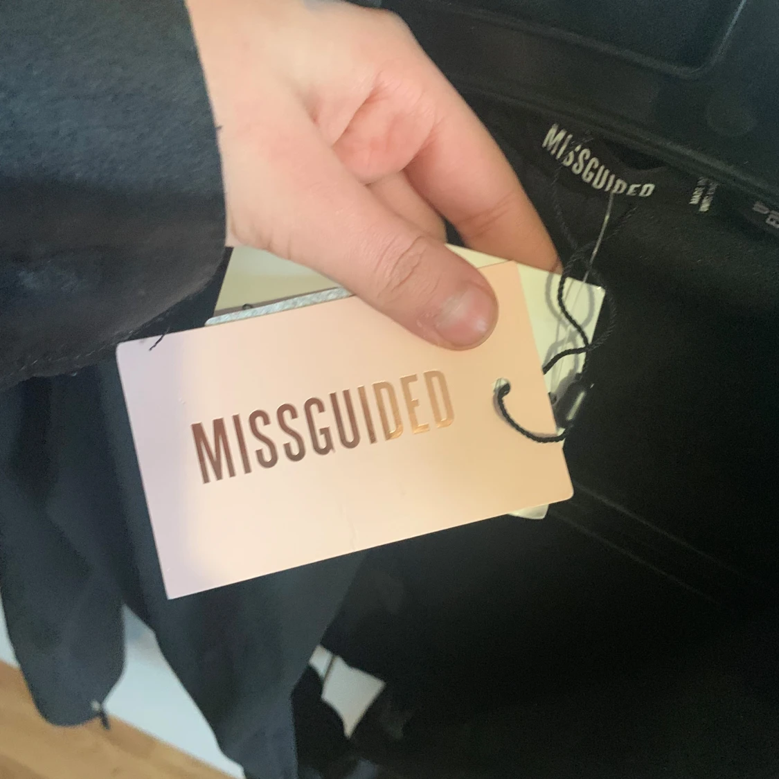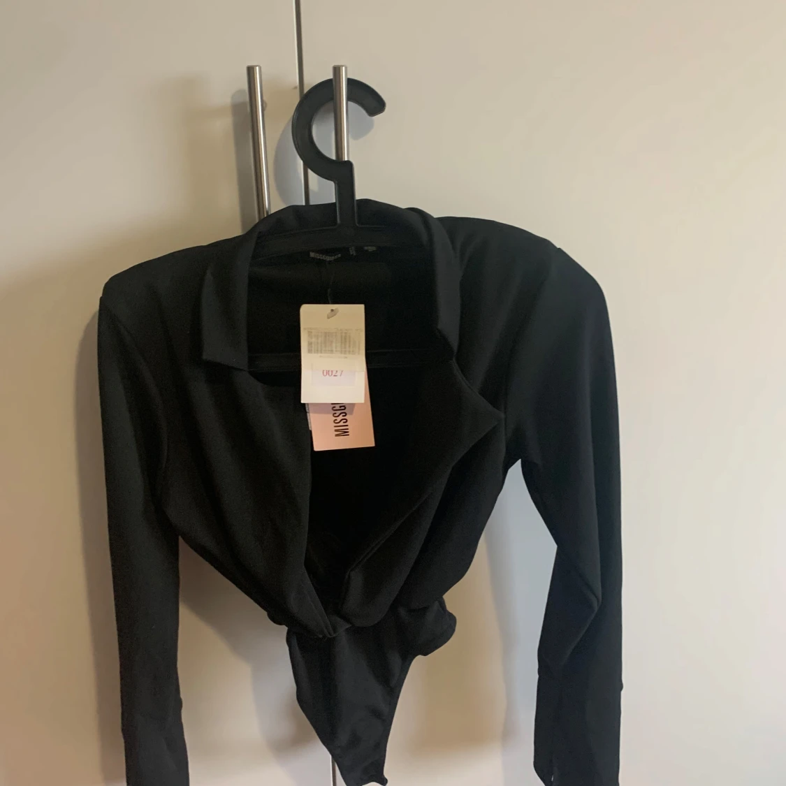 Säljer en snygg svart bodysuit från Missguided med djup urringning och krage. Den har långa ärmar och en figurnära passform. Perfekt för en stilren look.