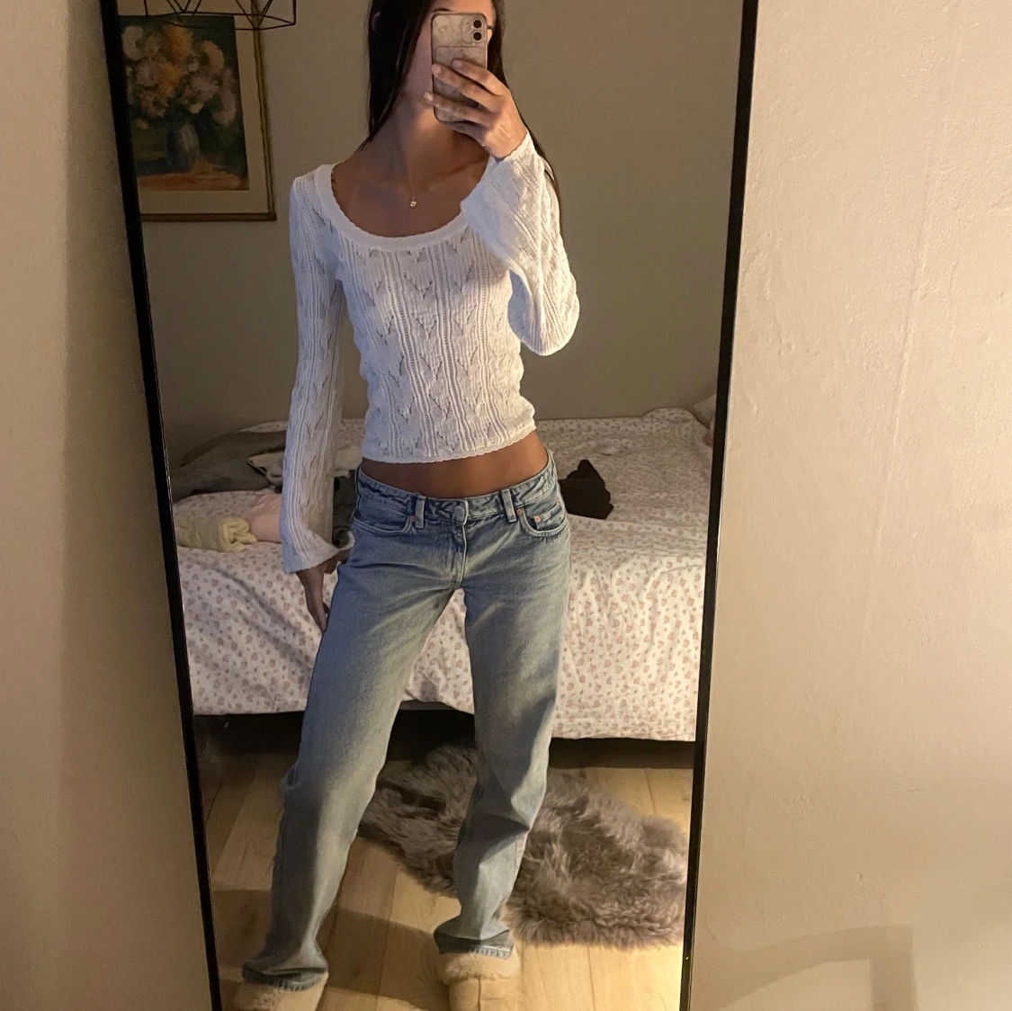 Säljer en vit stickad tröja med lång ärm och ett fint mönster. Tröjan är croppad och har en rund halsringning. Perfekt för en stilren och mysig look.