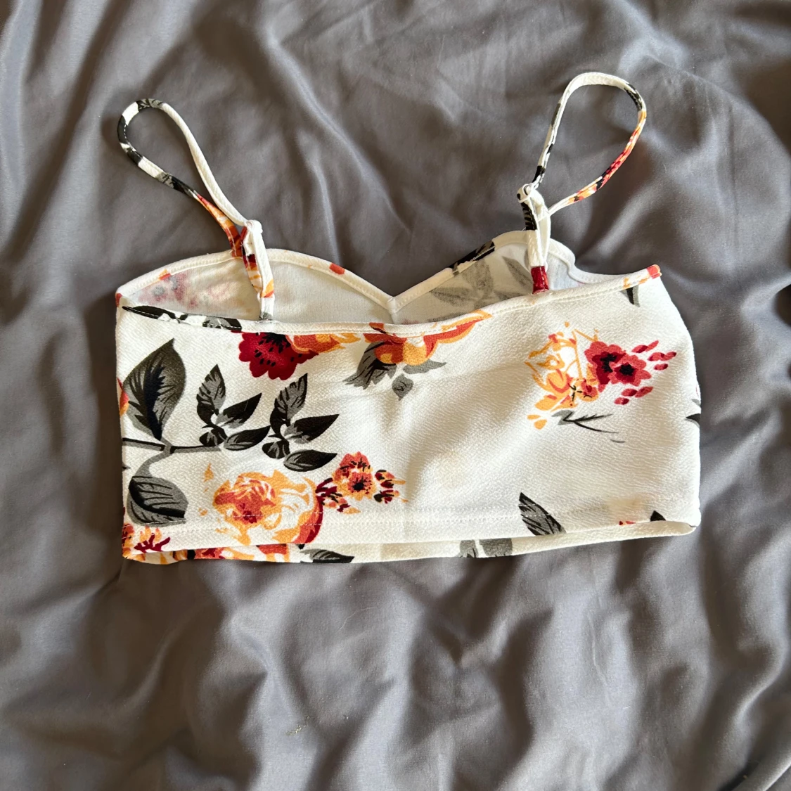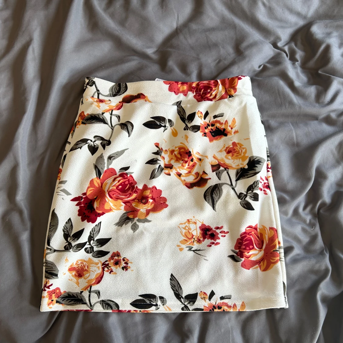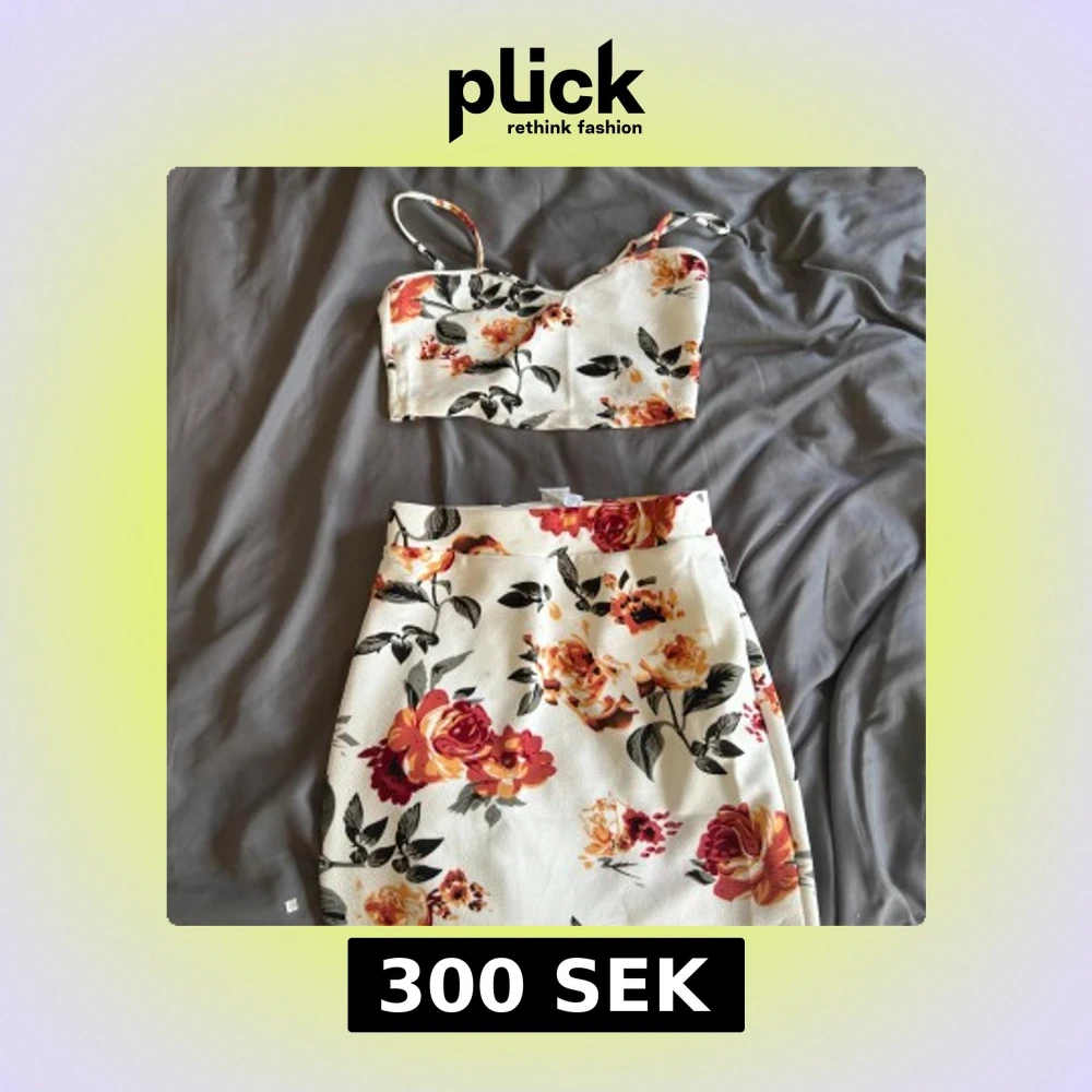 Säljer en vit croppad linne och en kjol från SHEIN med färgglatt blommönster i rött, orange och gult. Toppen har smala axelband och en hjärtformad urringning. Perfekt för varma dagar och somriga outfits!den är aldrig använd heller