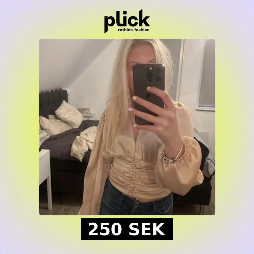 Säljer en elegant beige omlottblus med långa ärmar och v-ringning. Blusen har en smickrande rynkad detalj framtill som ger en fin passform. Perfekt för en stilren look.