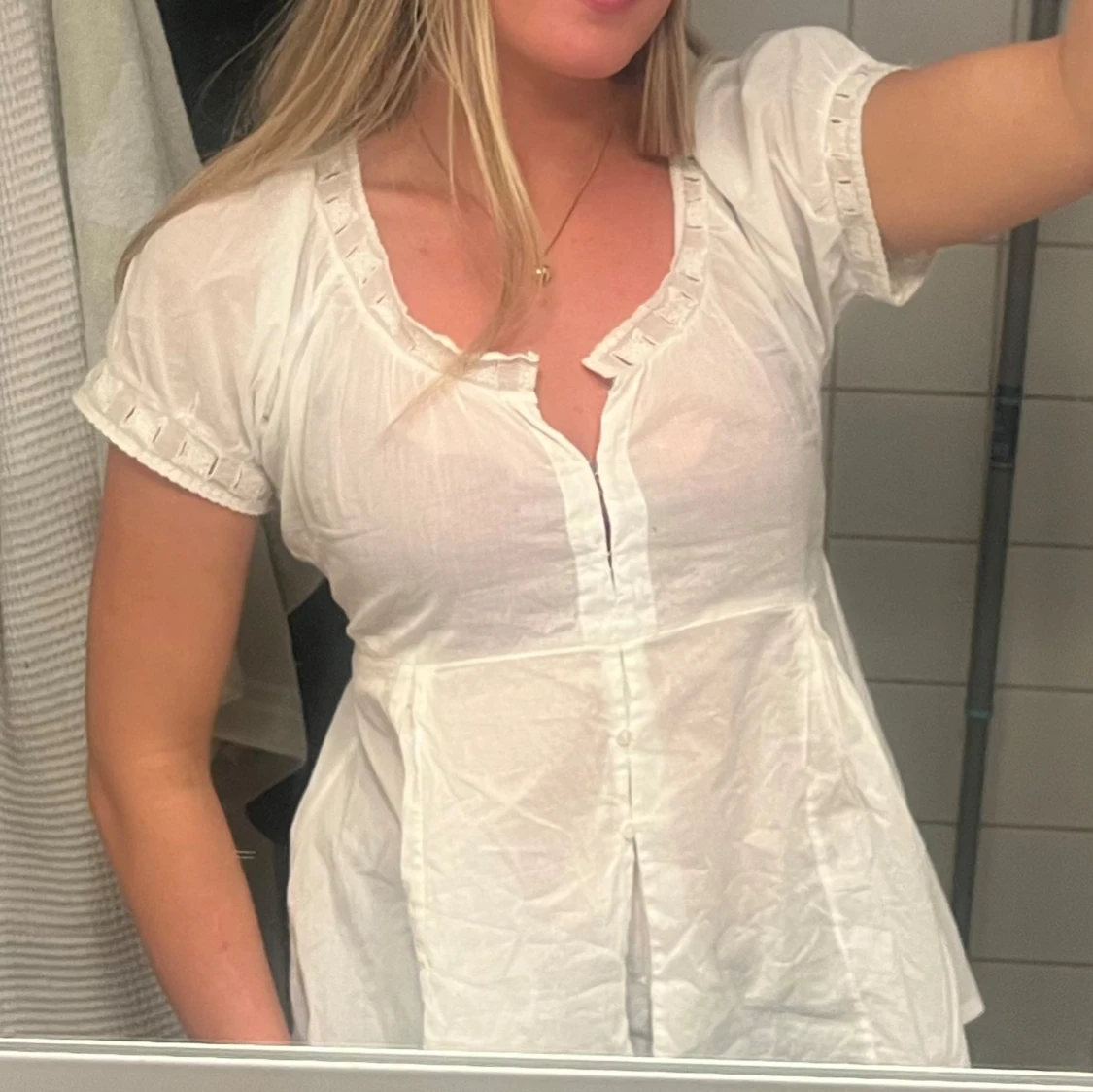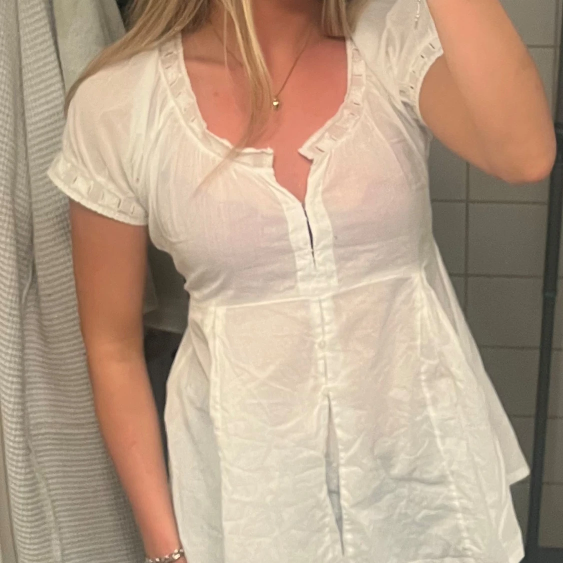 Säljer en söt vit blus med korta ärmar och rund halsringning. Blusen har fina rynkade detaljer vid ärmslut och hals. Perfekt för en somrig look!
