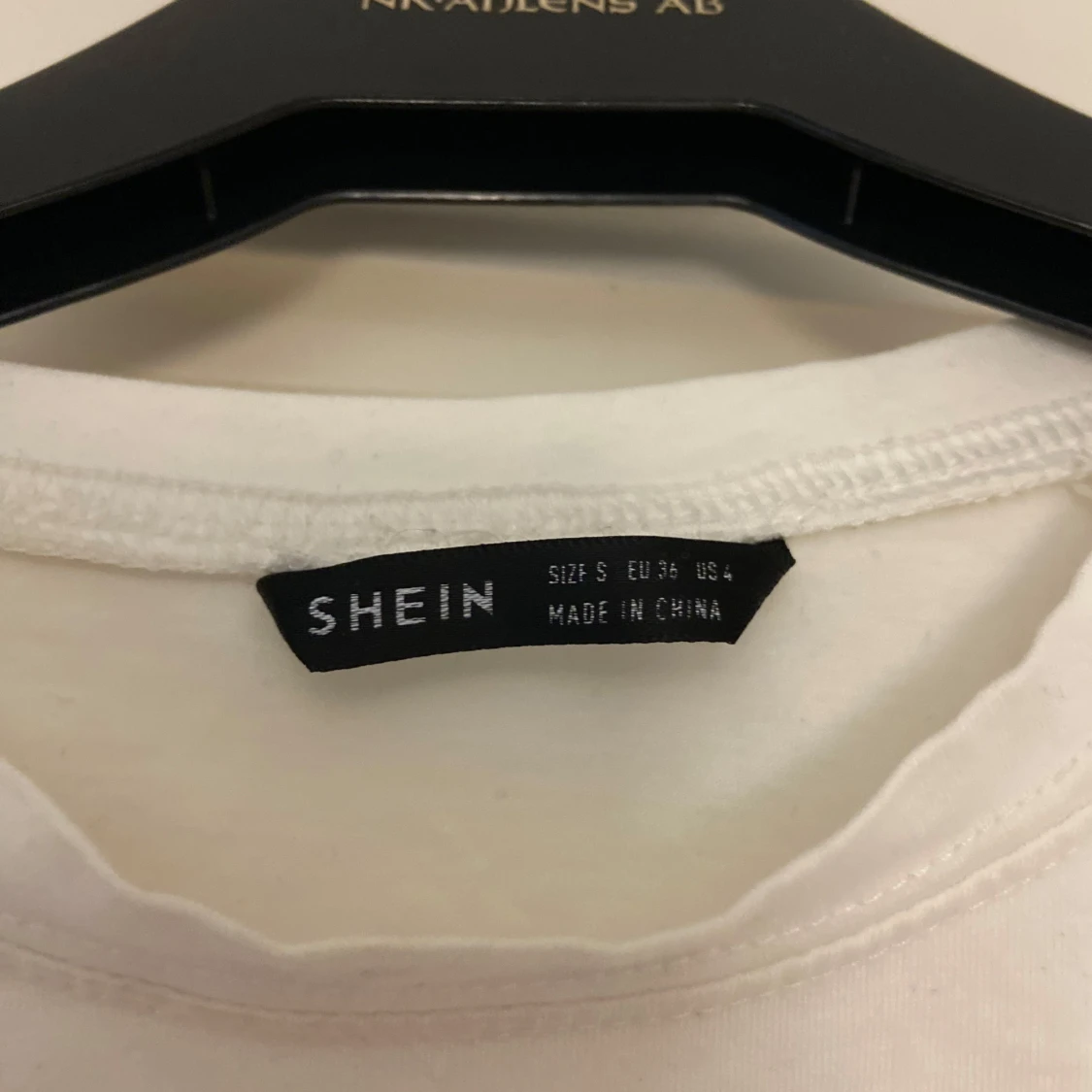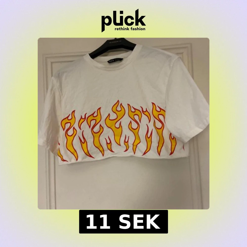 Säljer en cool vit croppad t-shirt från Shein med ett eldtryck i gult och rött längs nederkanten. Perfekt för en trendig look. T-shirten har korta ärmar och rund halsringning.
