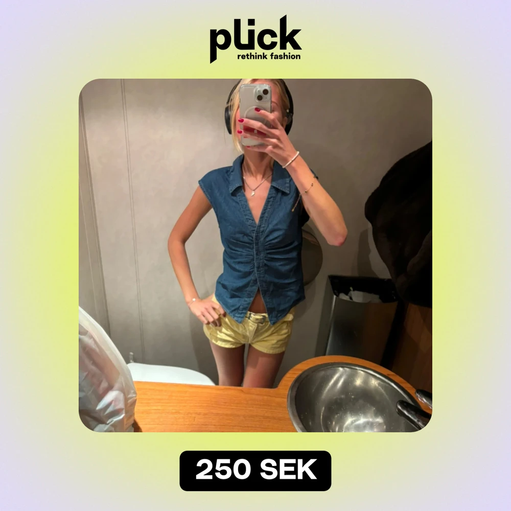 Snygg blå jeansblus i tight passform med korta ärmar och knappar framtill. Perfekt för sommardagar eller en avslappnad utekväll. Blusen har en stilren design med en lätt rynkad detalj vid bysten. Använd 3 gånger!